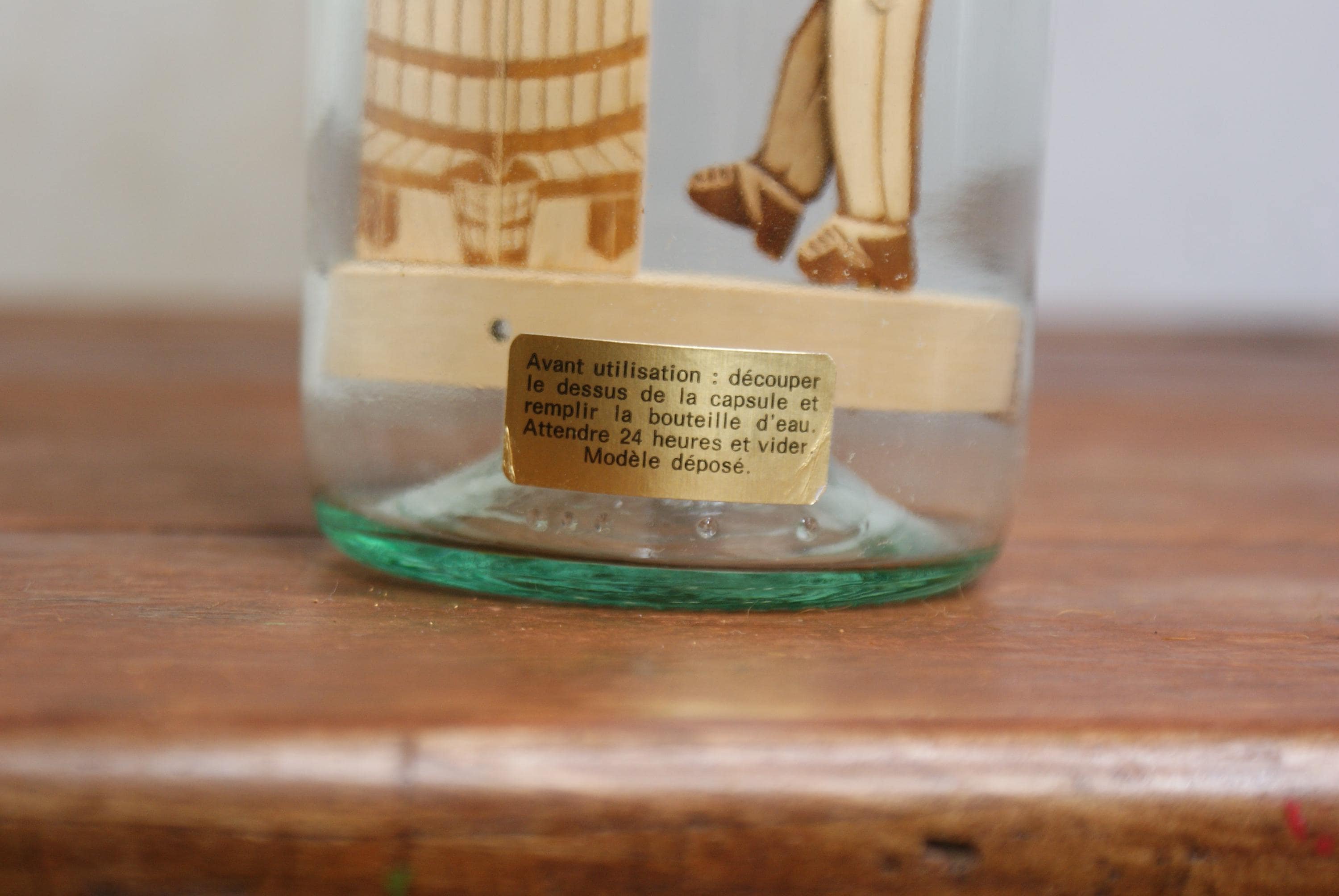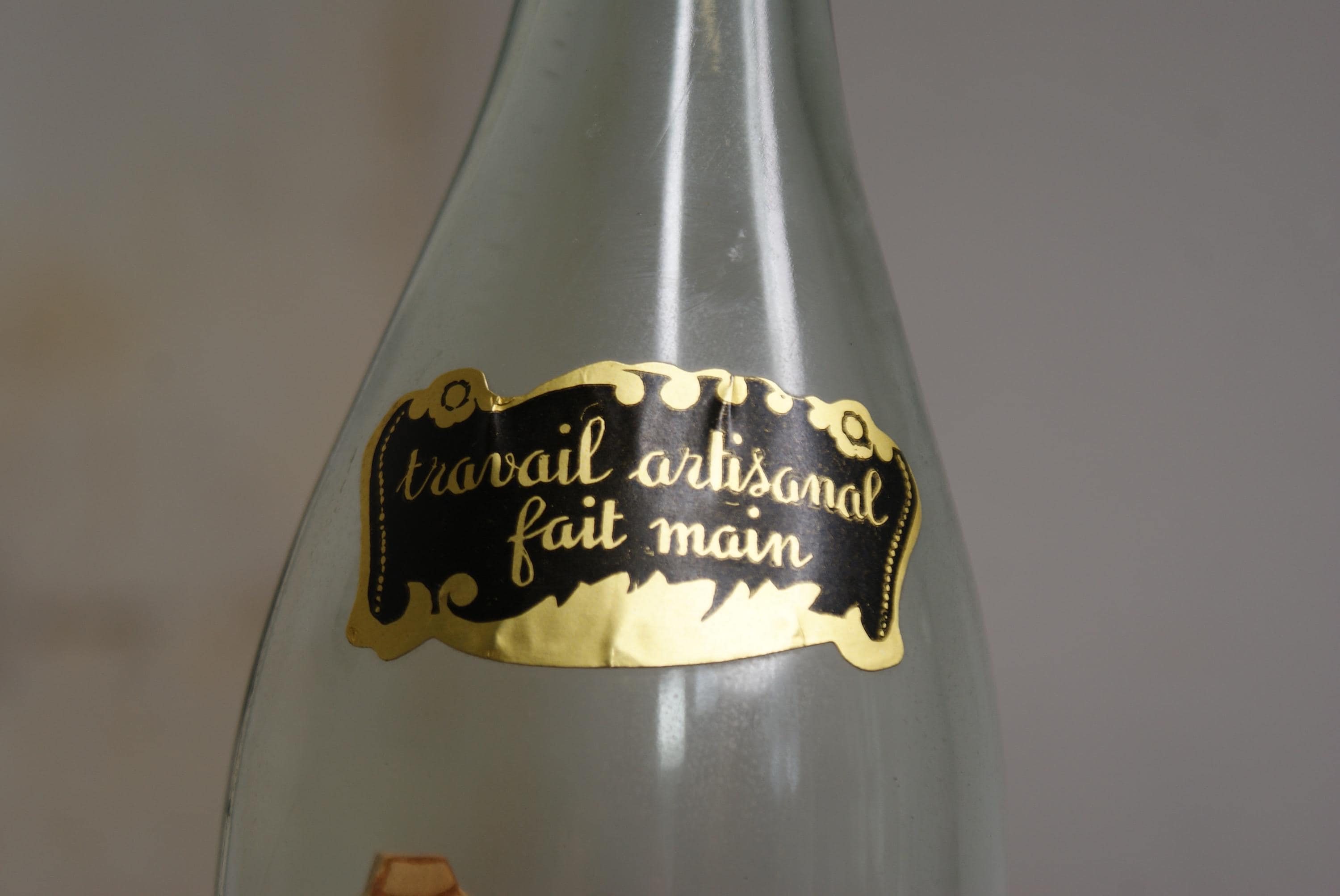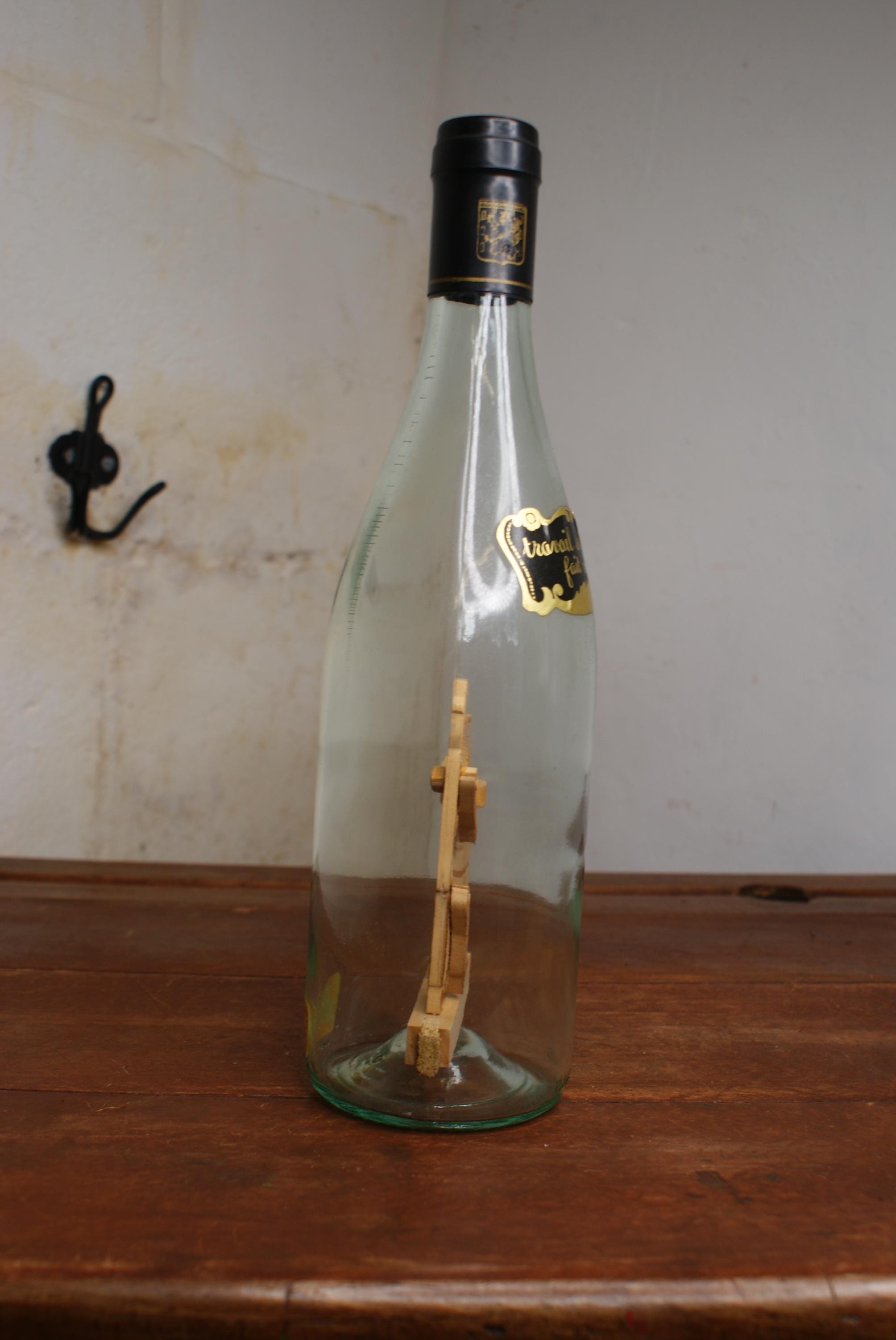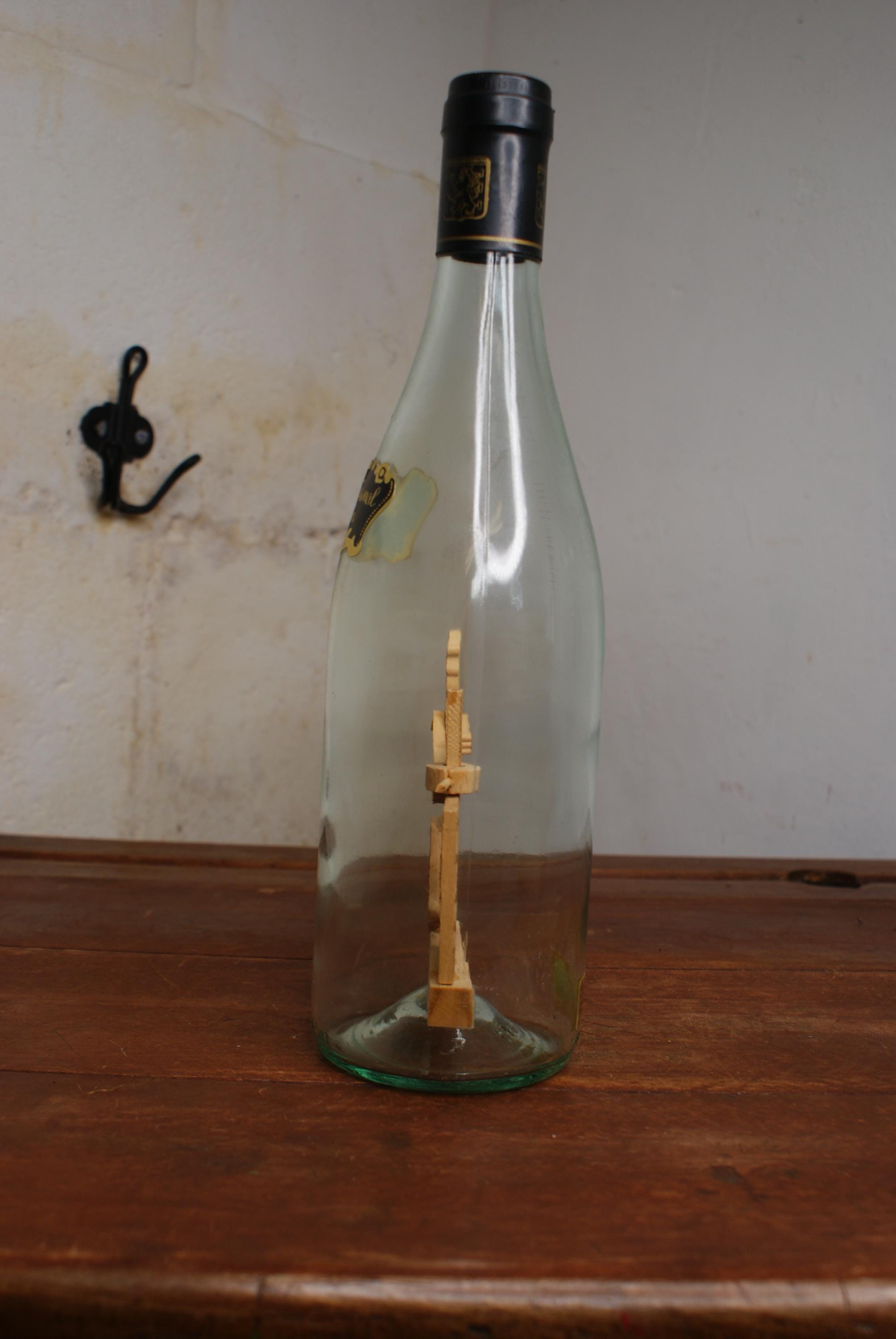 A lovely Piece of French folk art known as a whimsy bottle, this one features a man working and a grape press inside a sealed wine bottle. the label on the front translates to 'Artisanal work handmade' Whimsy bottles are subgenre of tramp art and known for the intricate and challenging process of placing the figures inside.