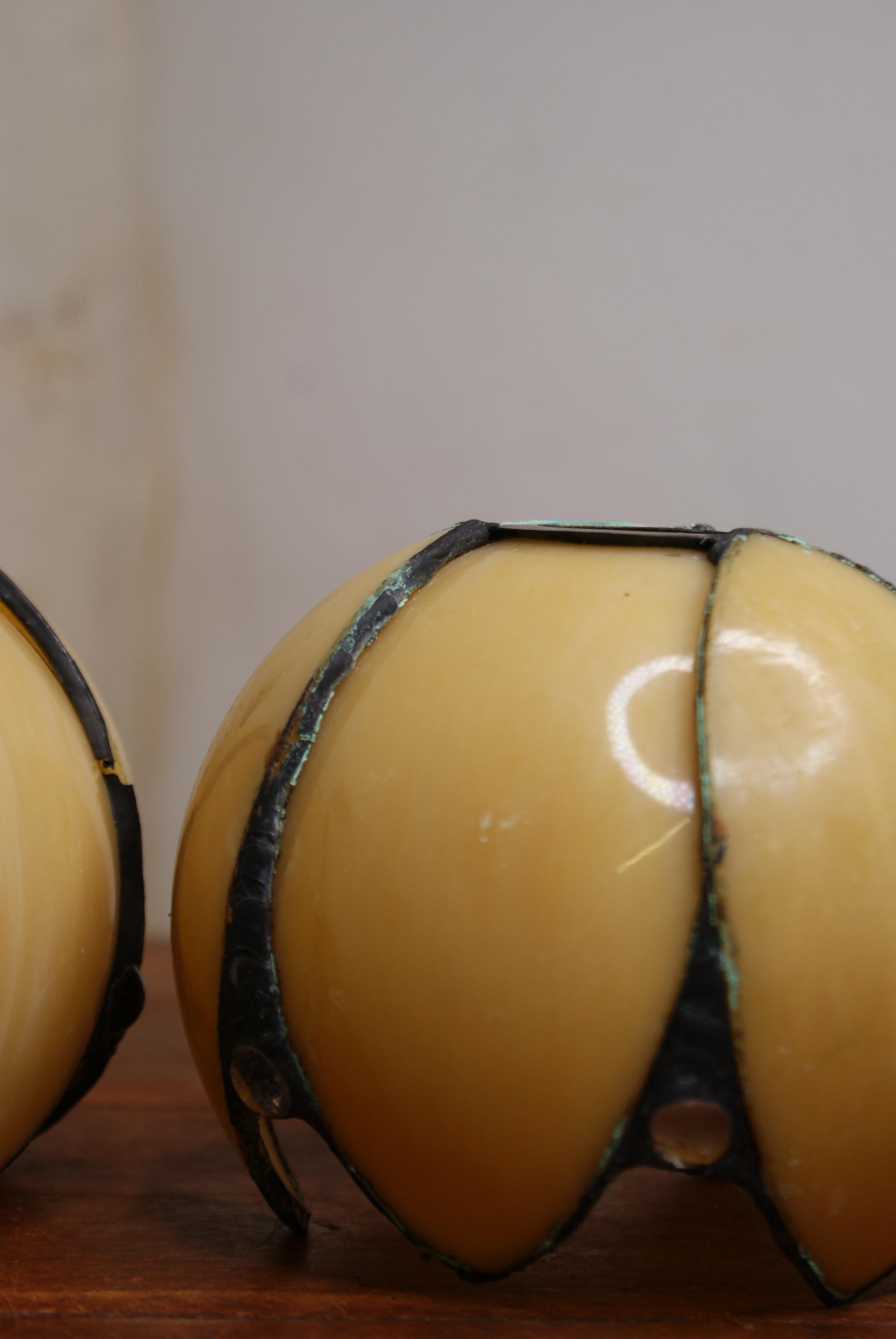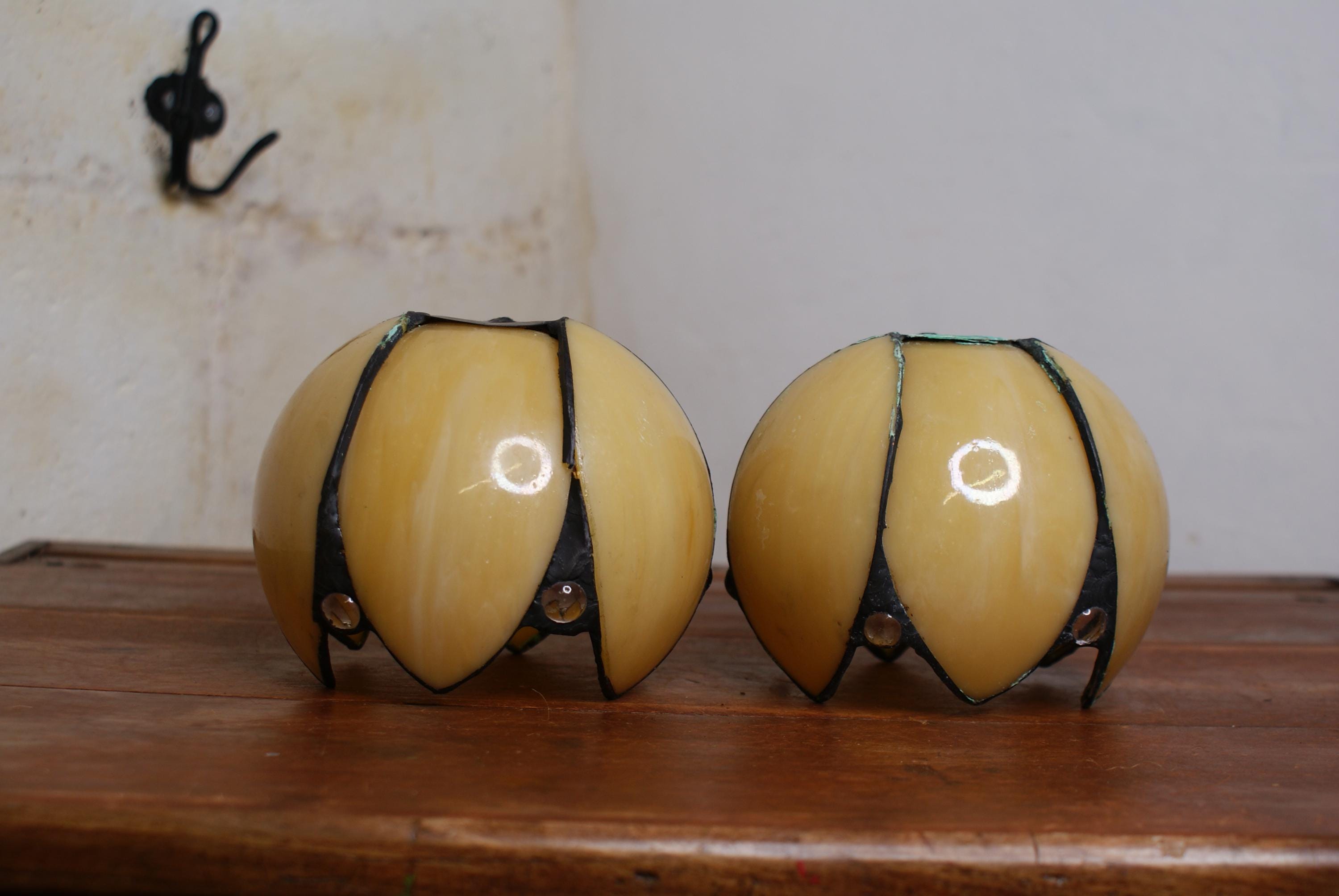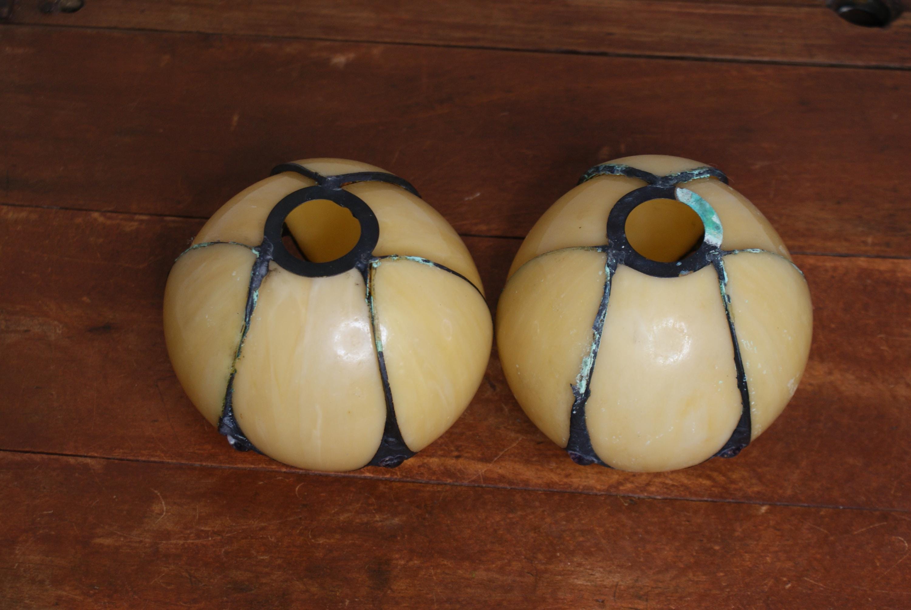 A lovely pair of vintage tiffany style light shades. These are a nice vintage condition with patina to the frame.