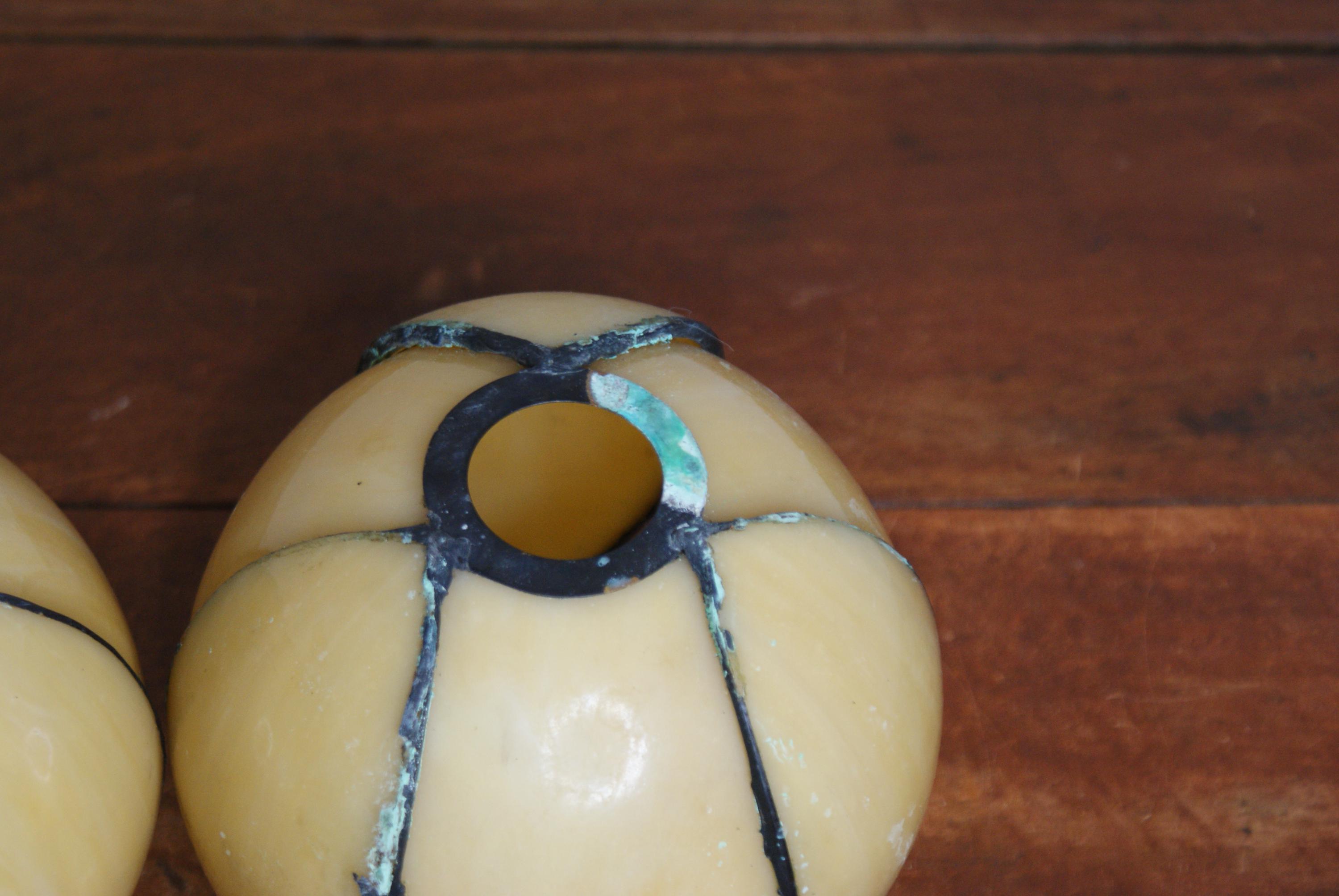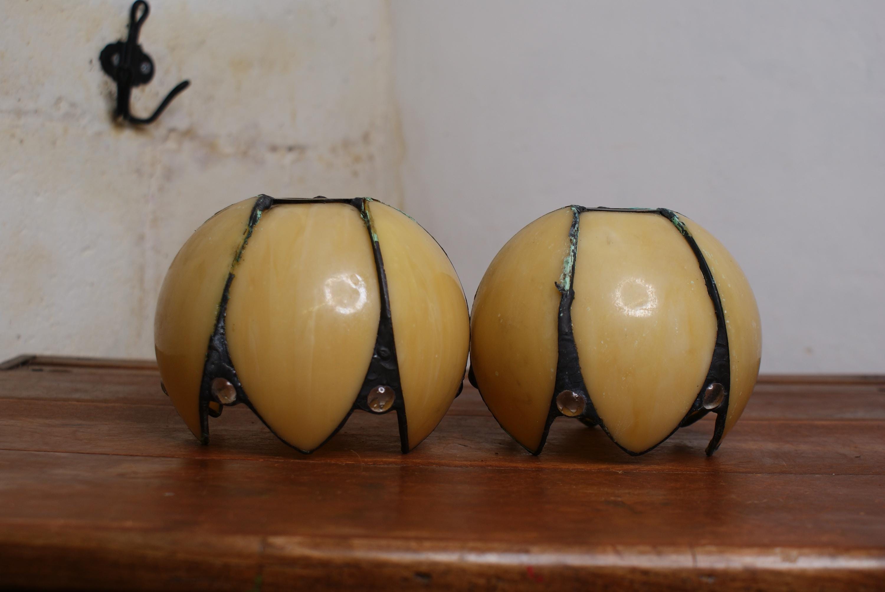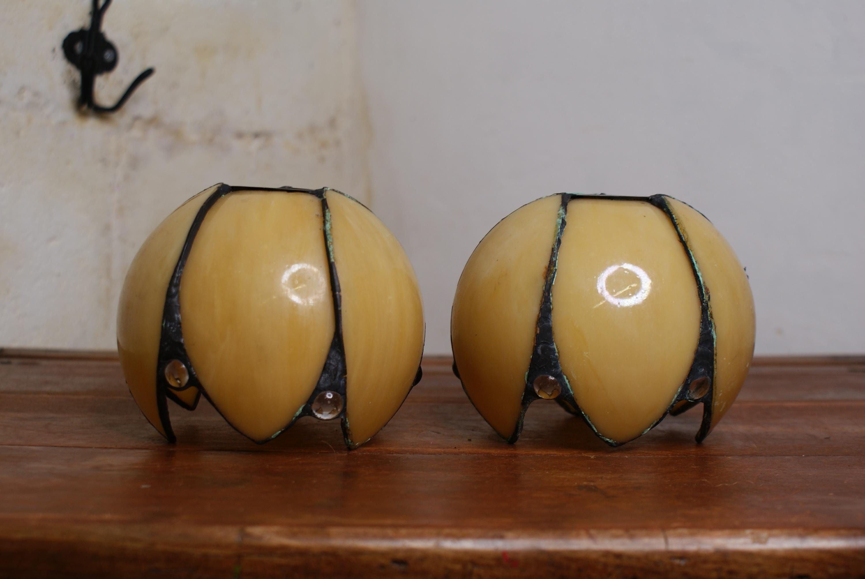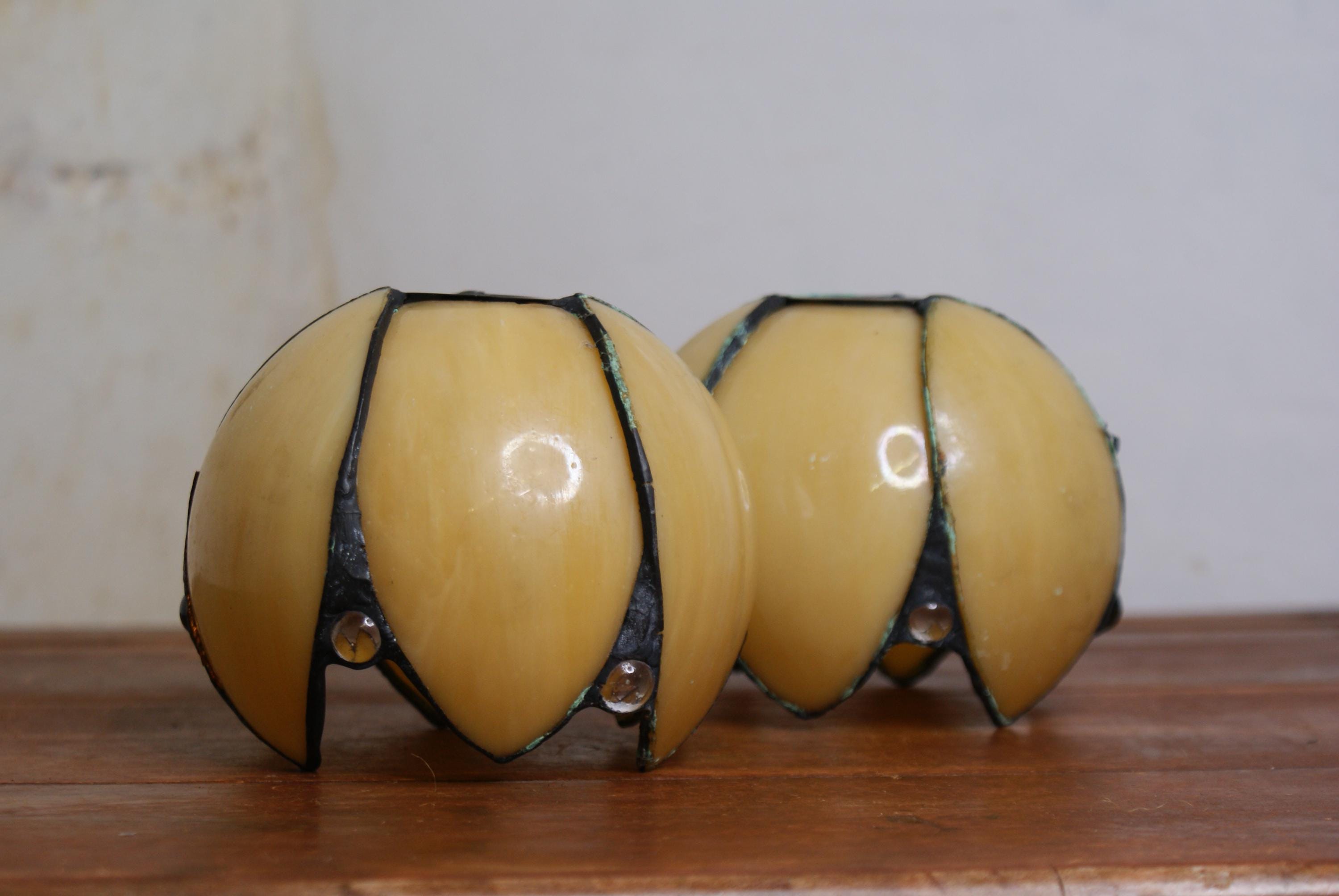 A lovely pair of vintage tiffany style light shades. These are a nice vintage condition with patina to the frame.