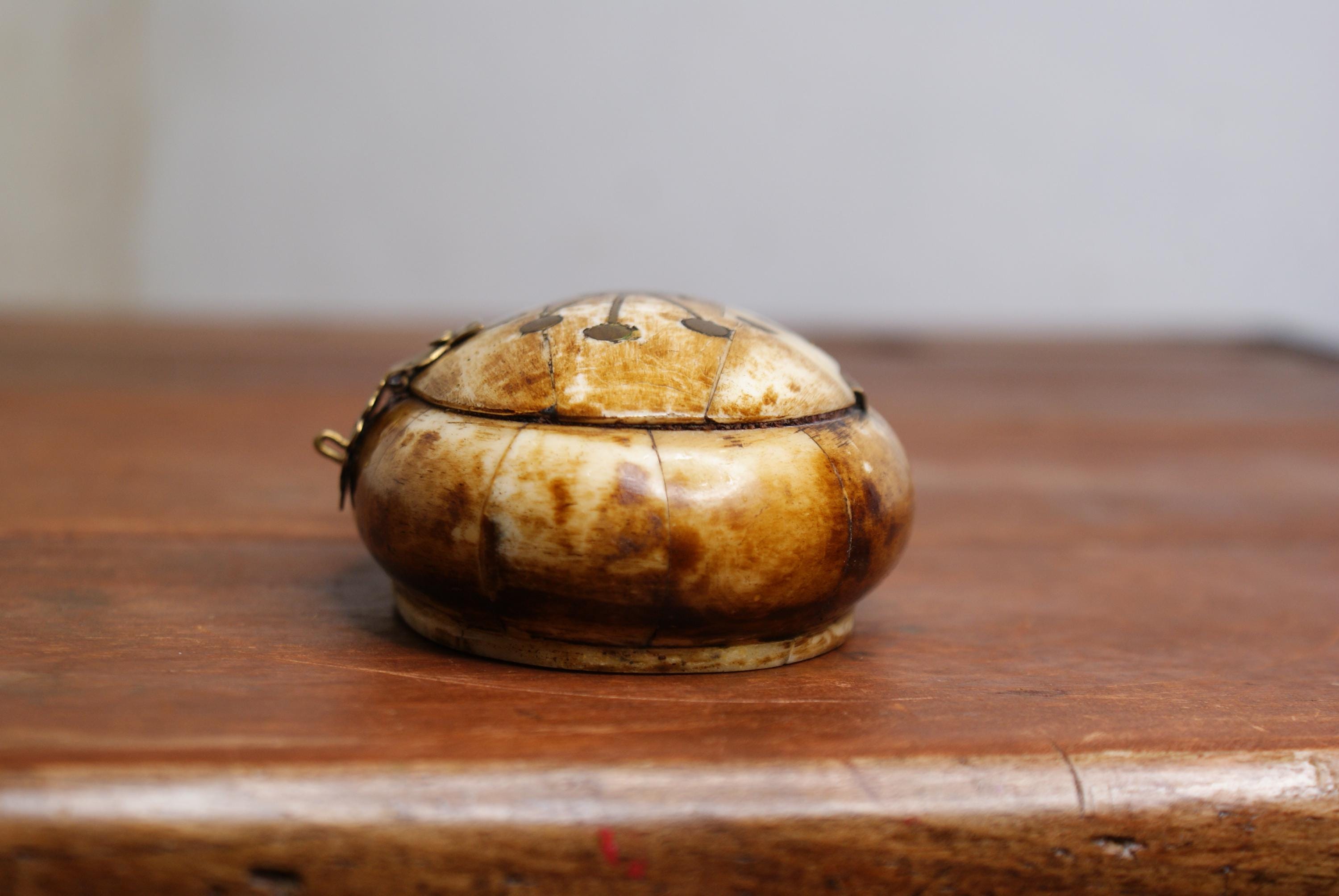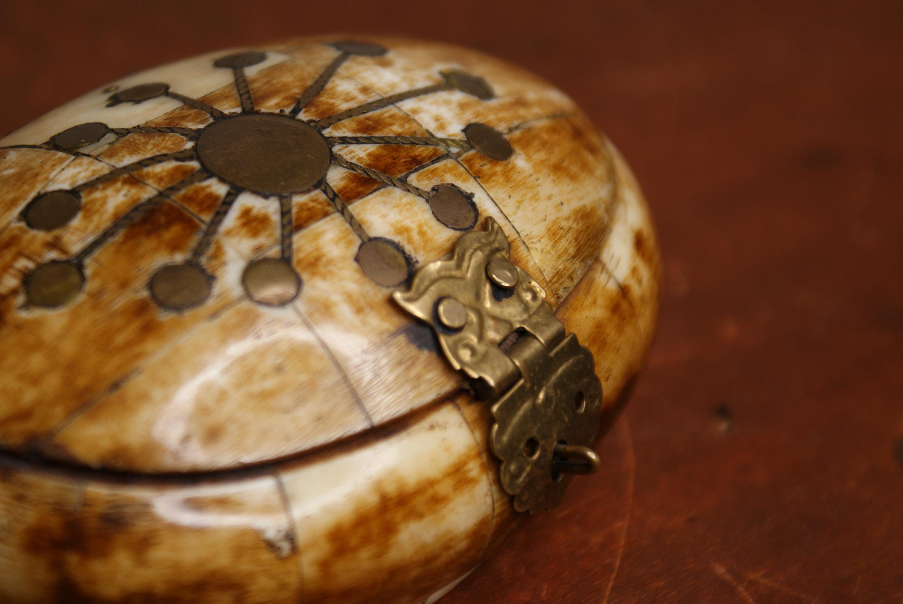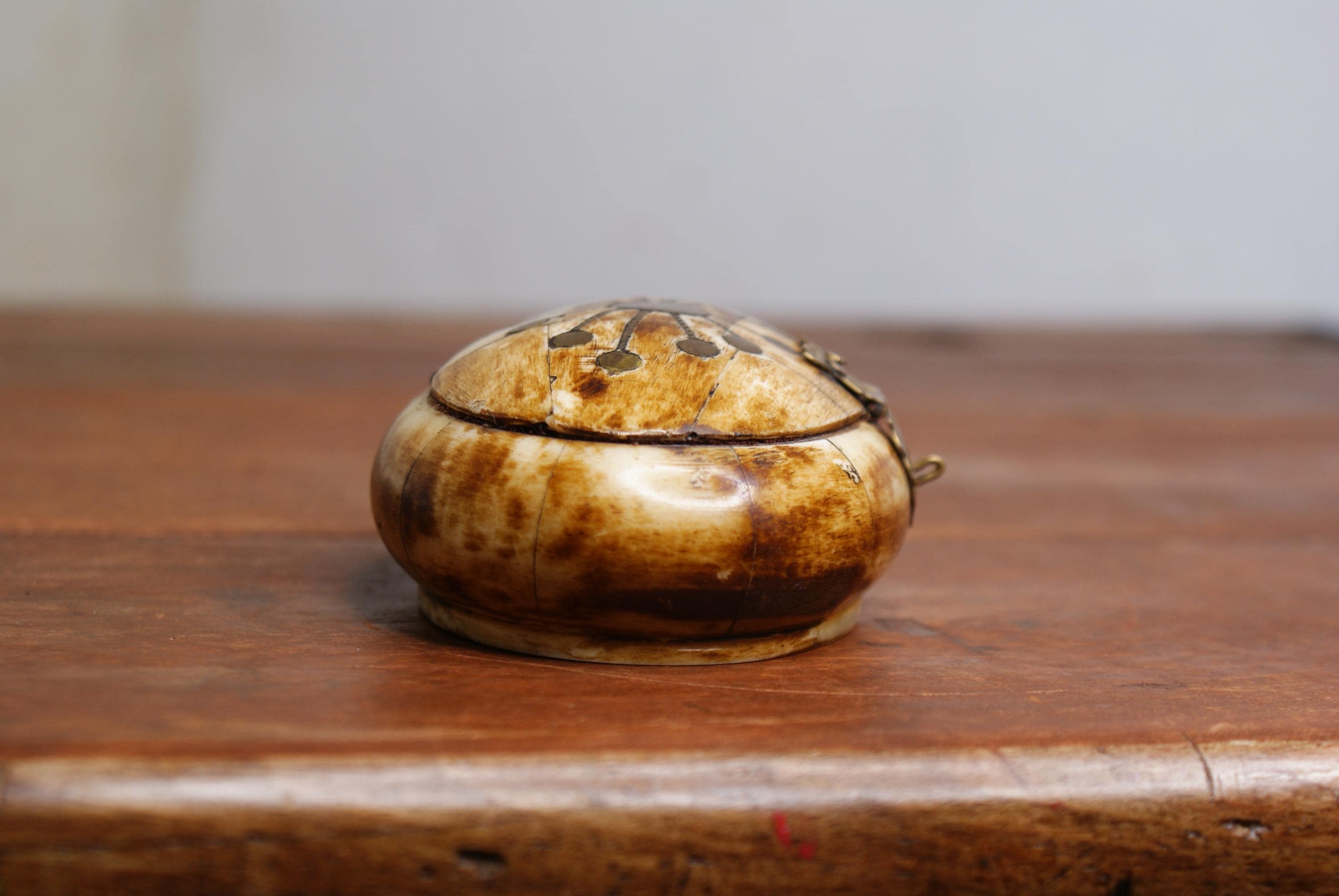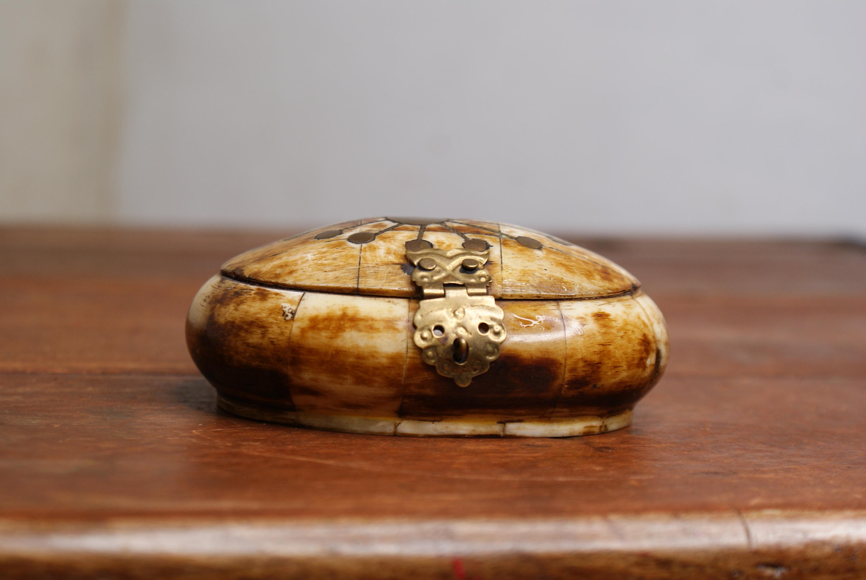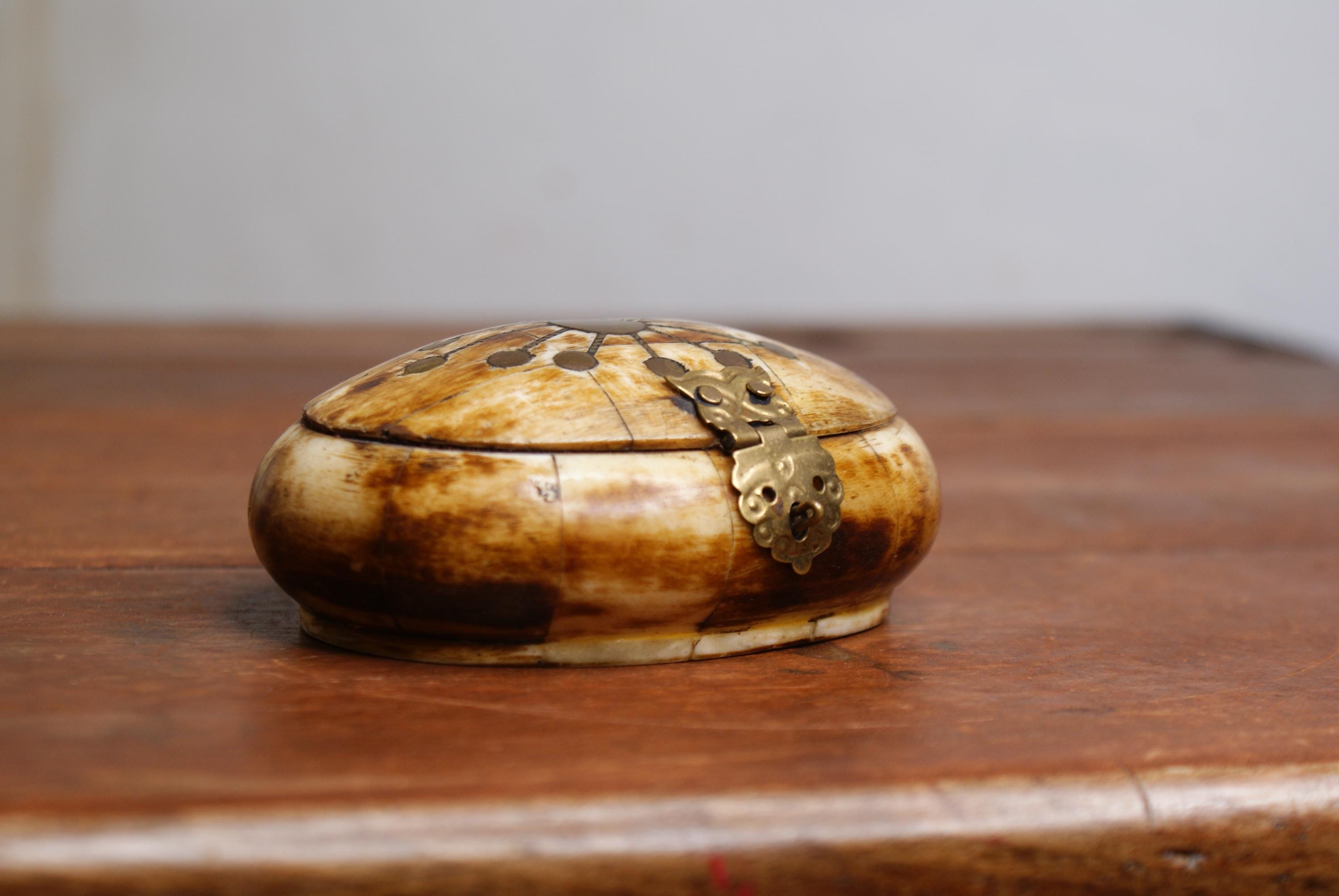Stunning camel bone trinket or pill box, lined with a lovely velvet inside the is a stunning decorative and functional piece.
