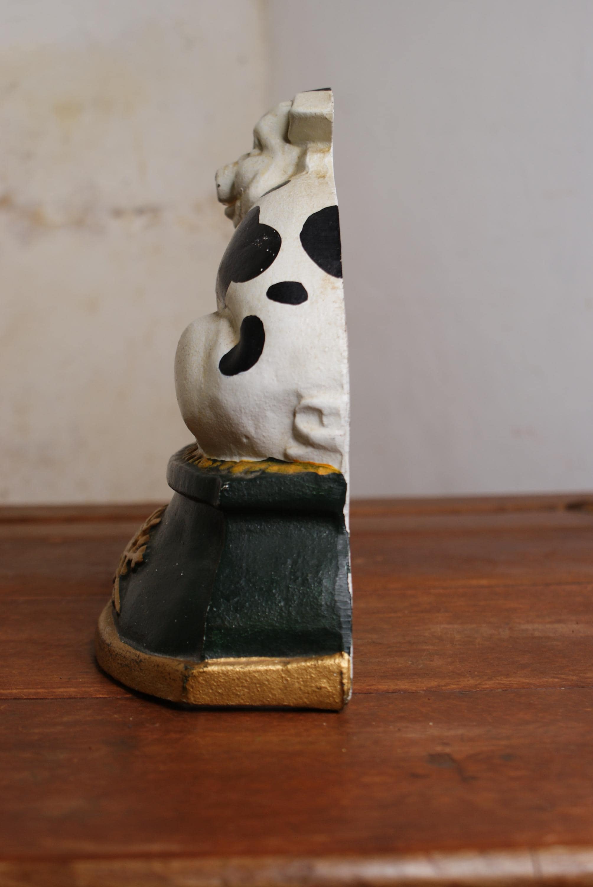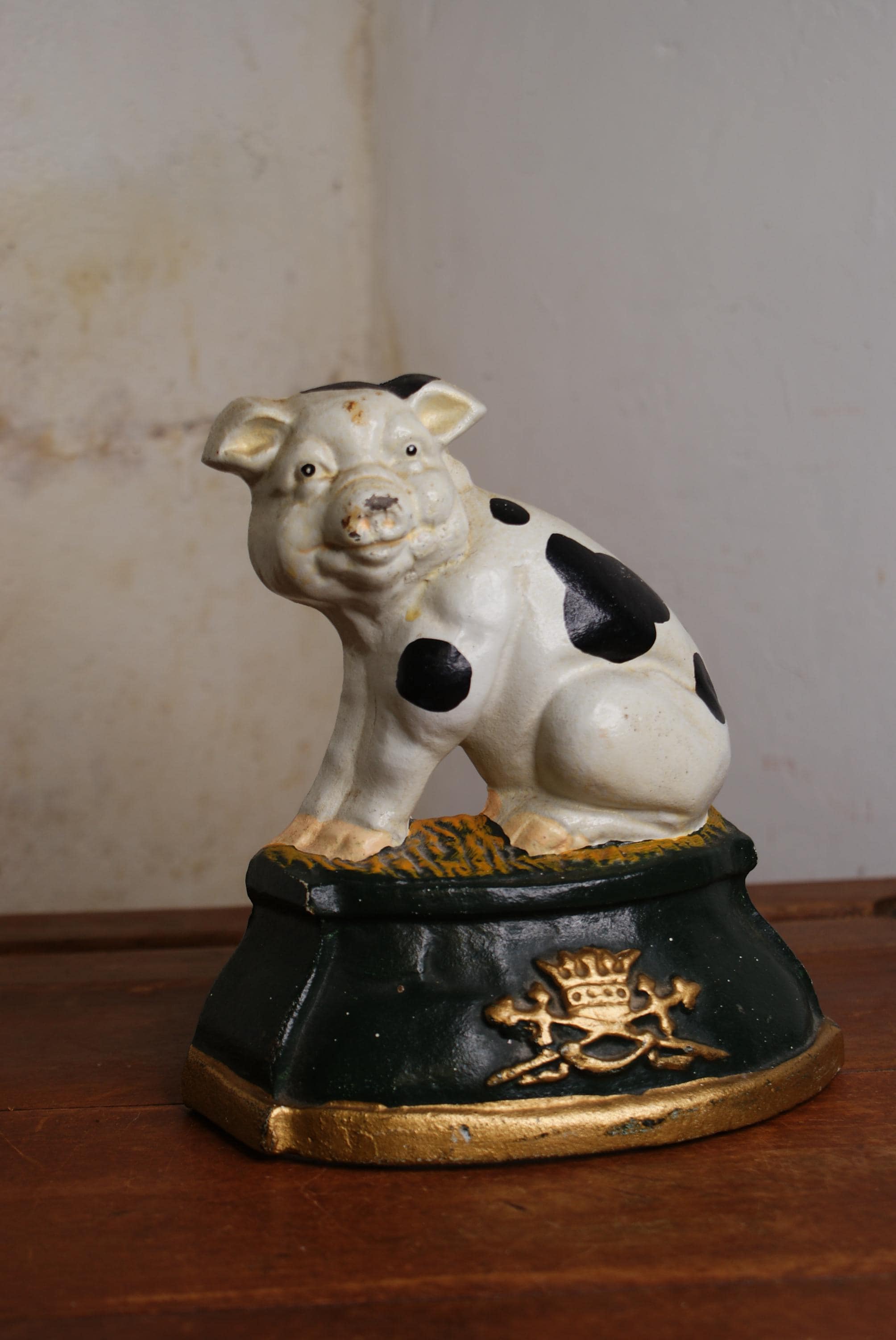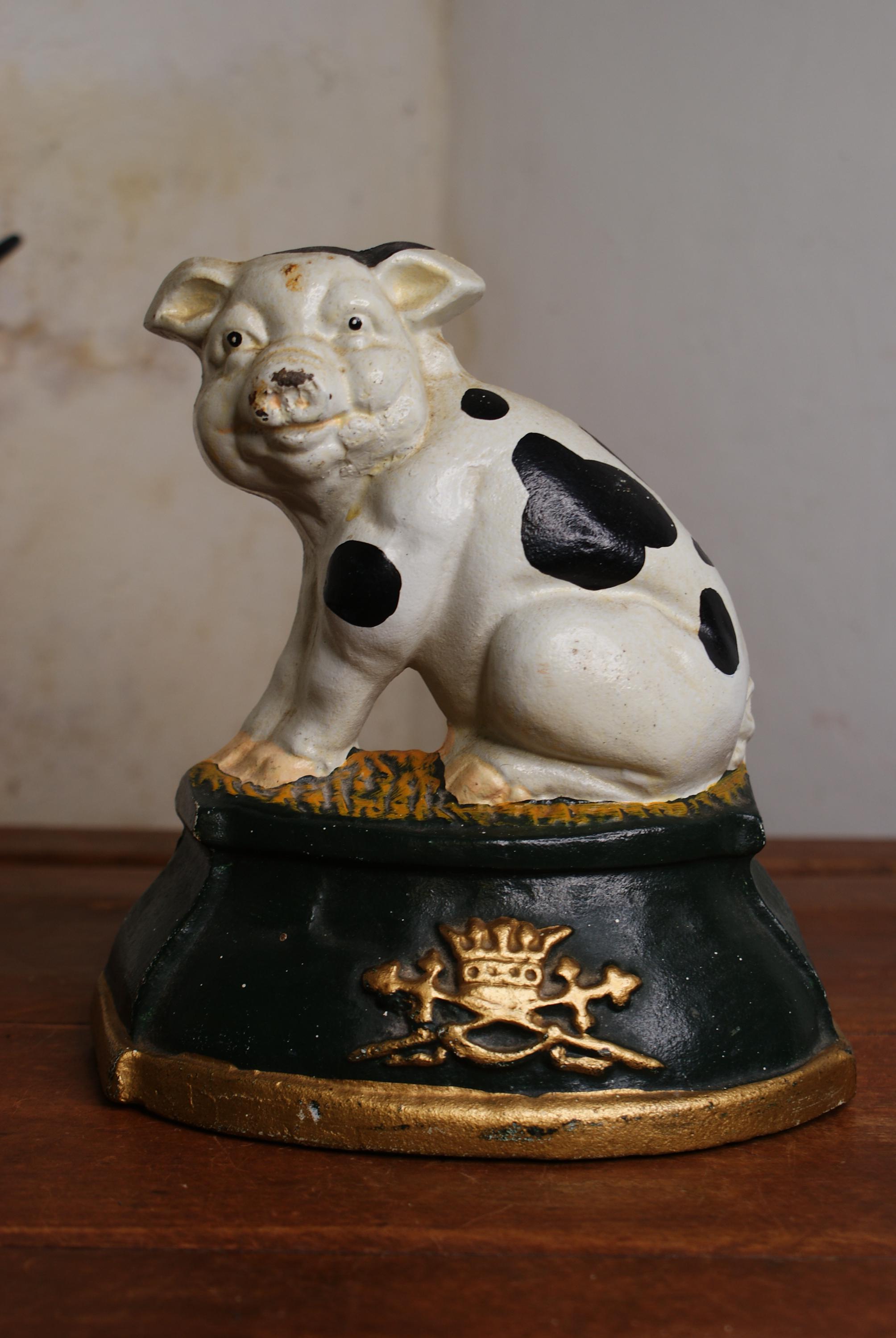 A charming vintage cast iron door stop of a pig. Some light patina to areas.
