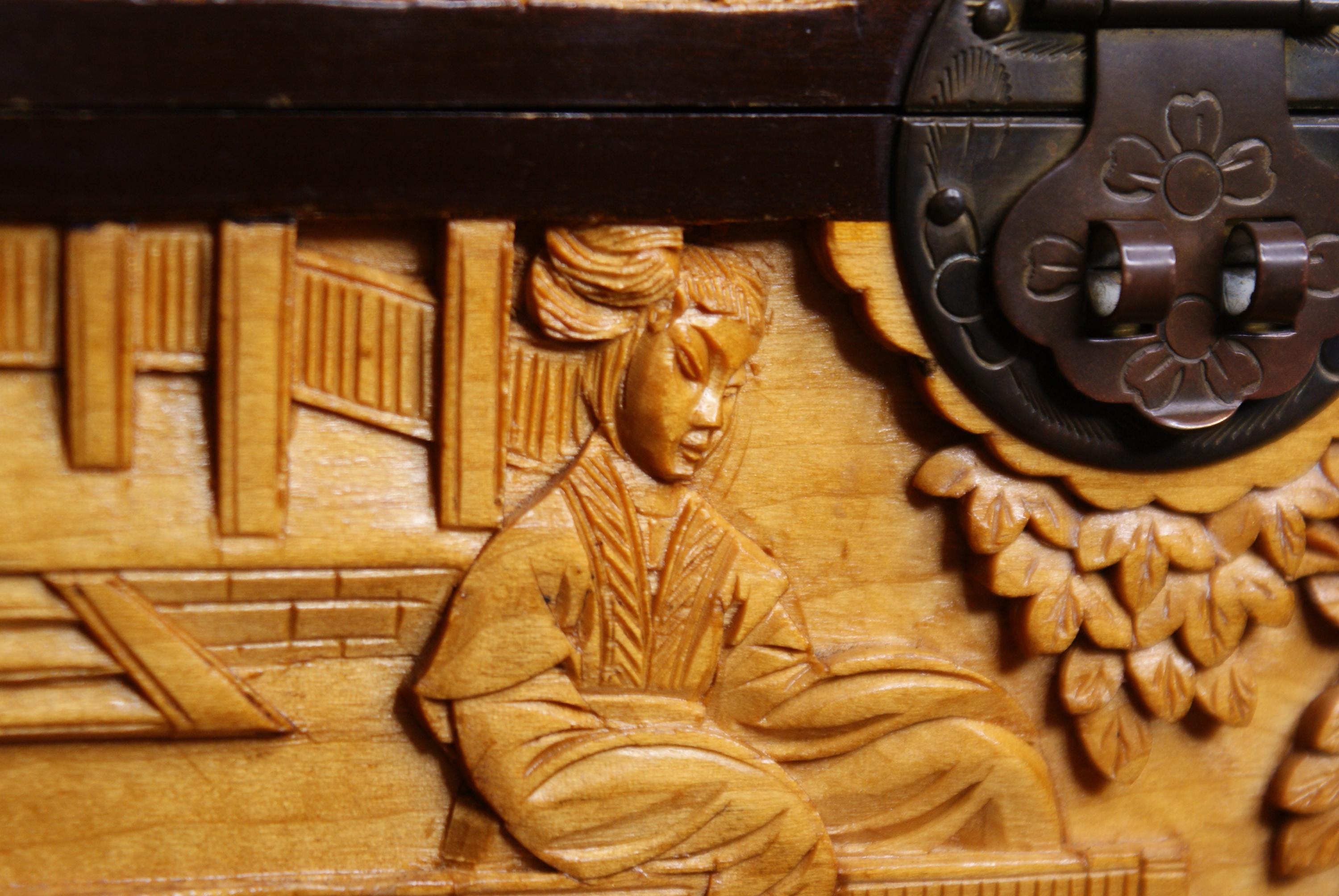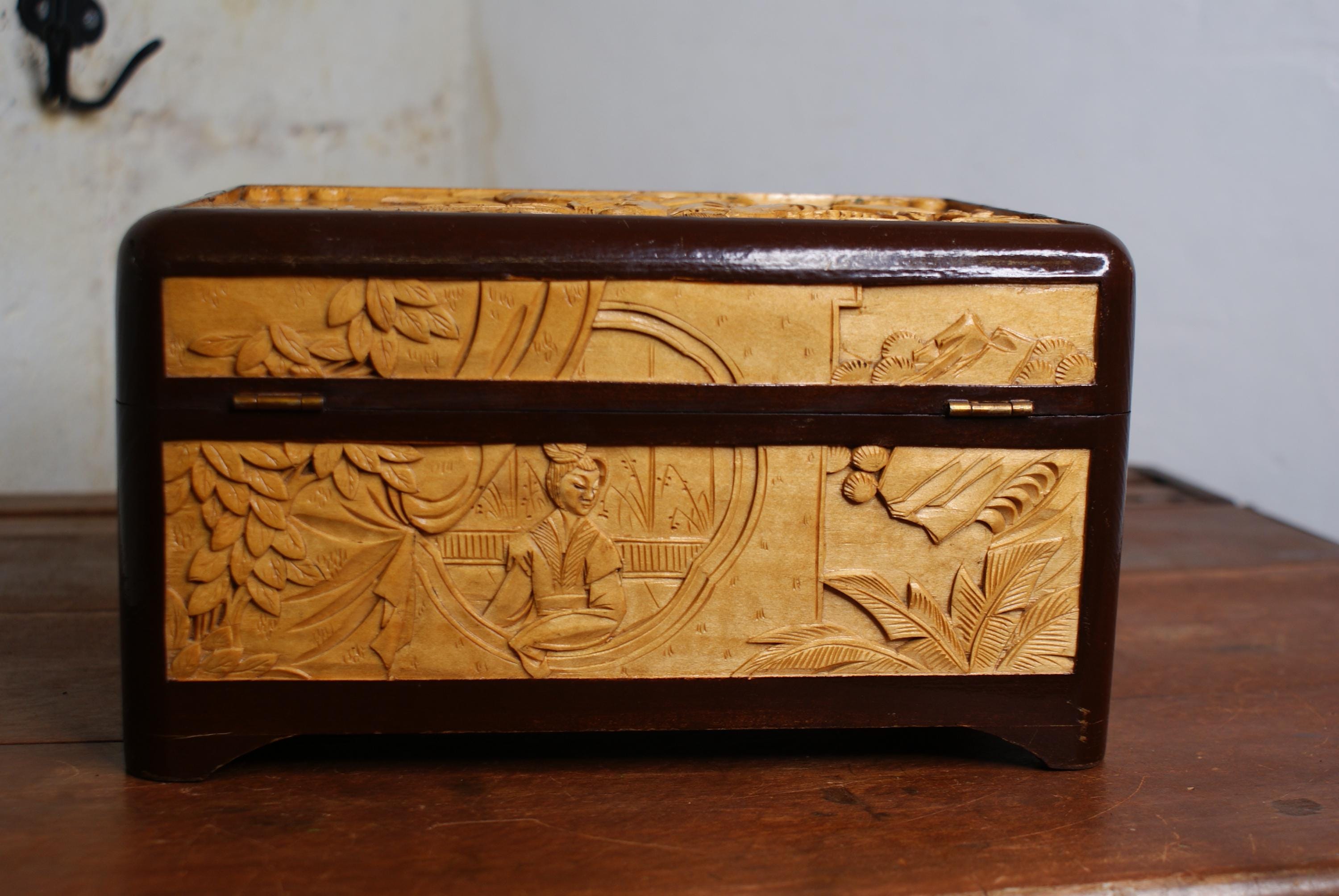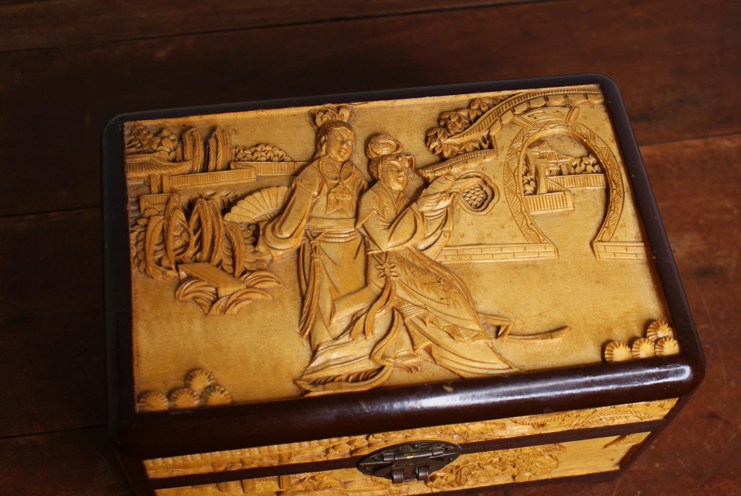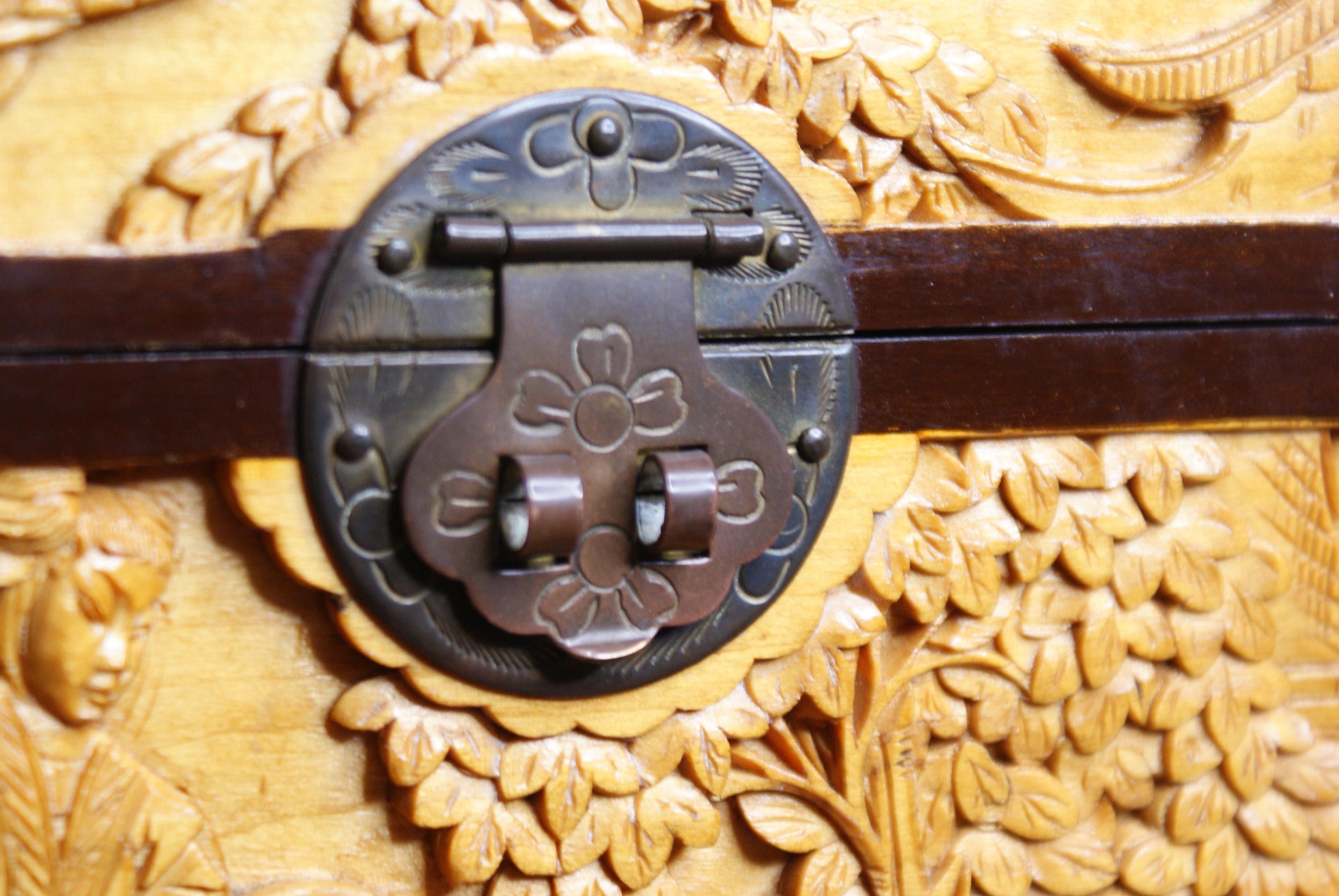 Stunning hand carved camphor box, in excellent condition with lovely high relief carvings.