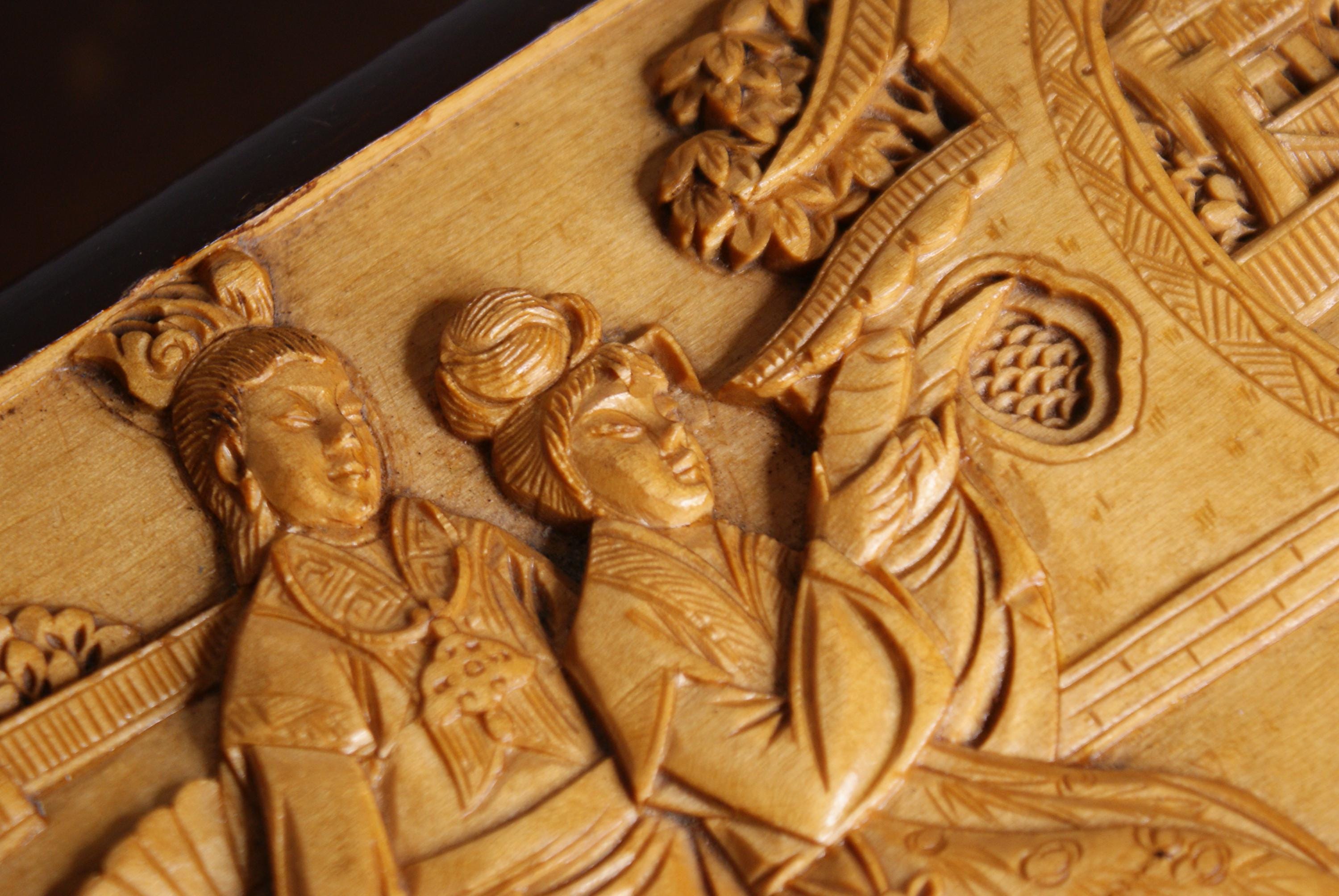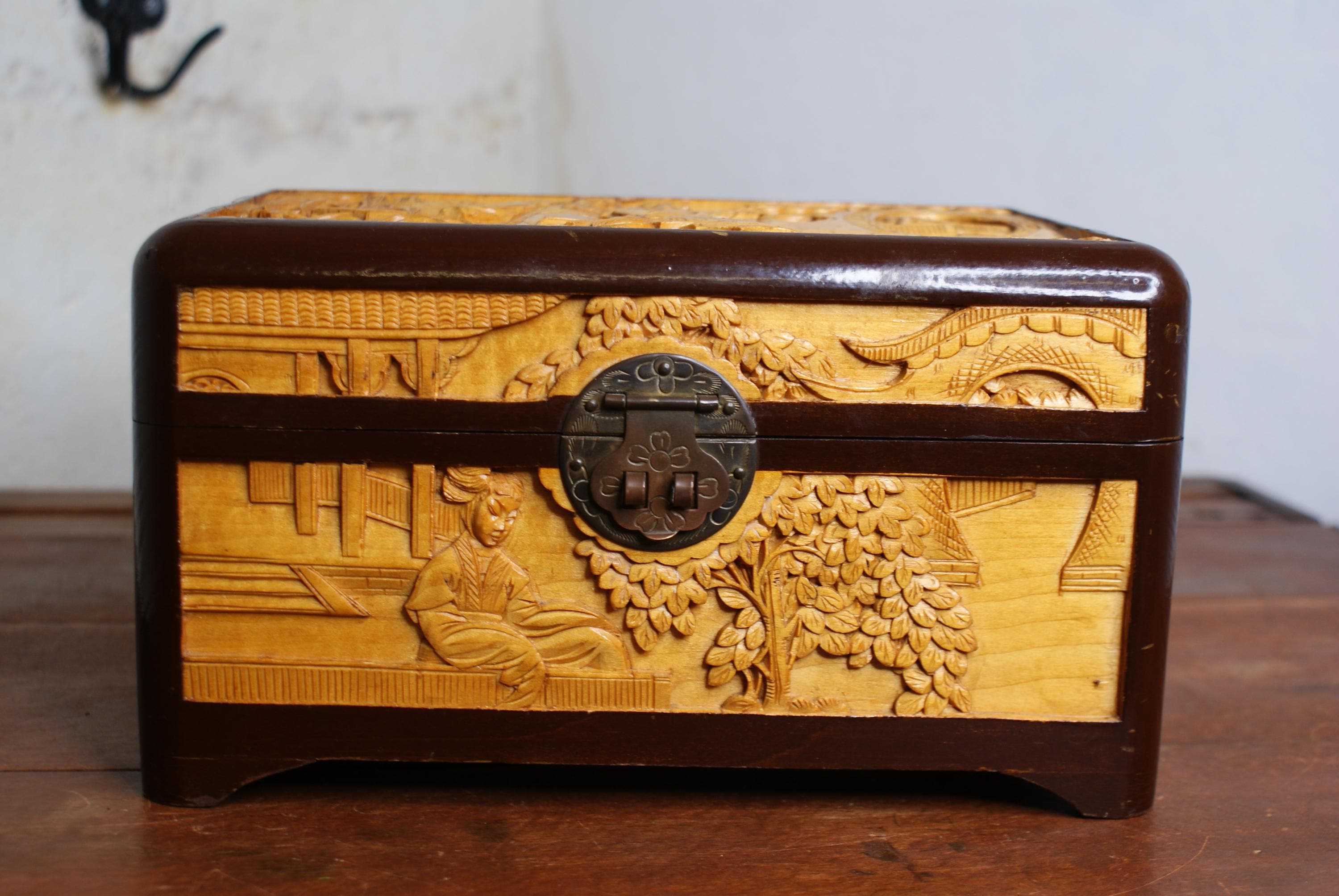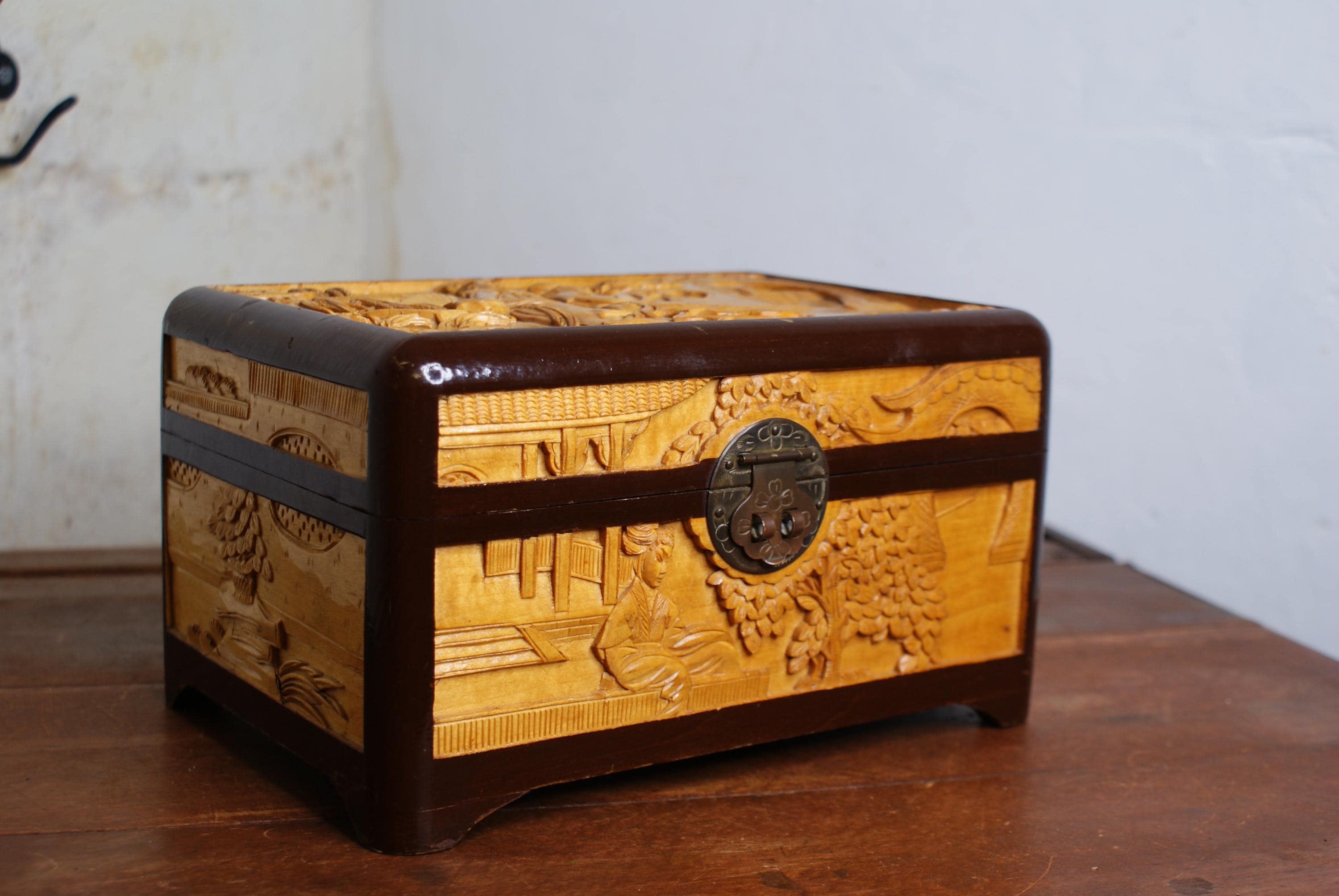 Stunning hand carved camphor box, in excellent condition with lovely high relief carvings.