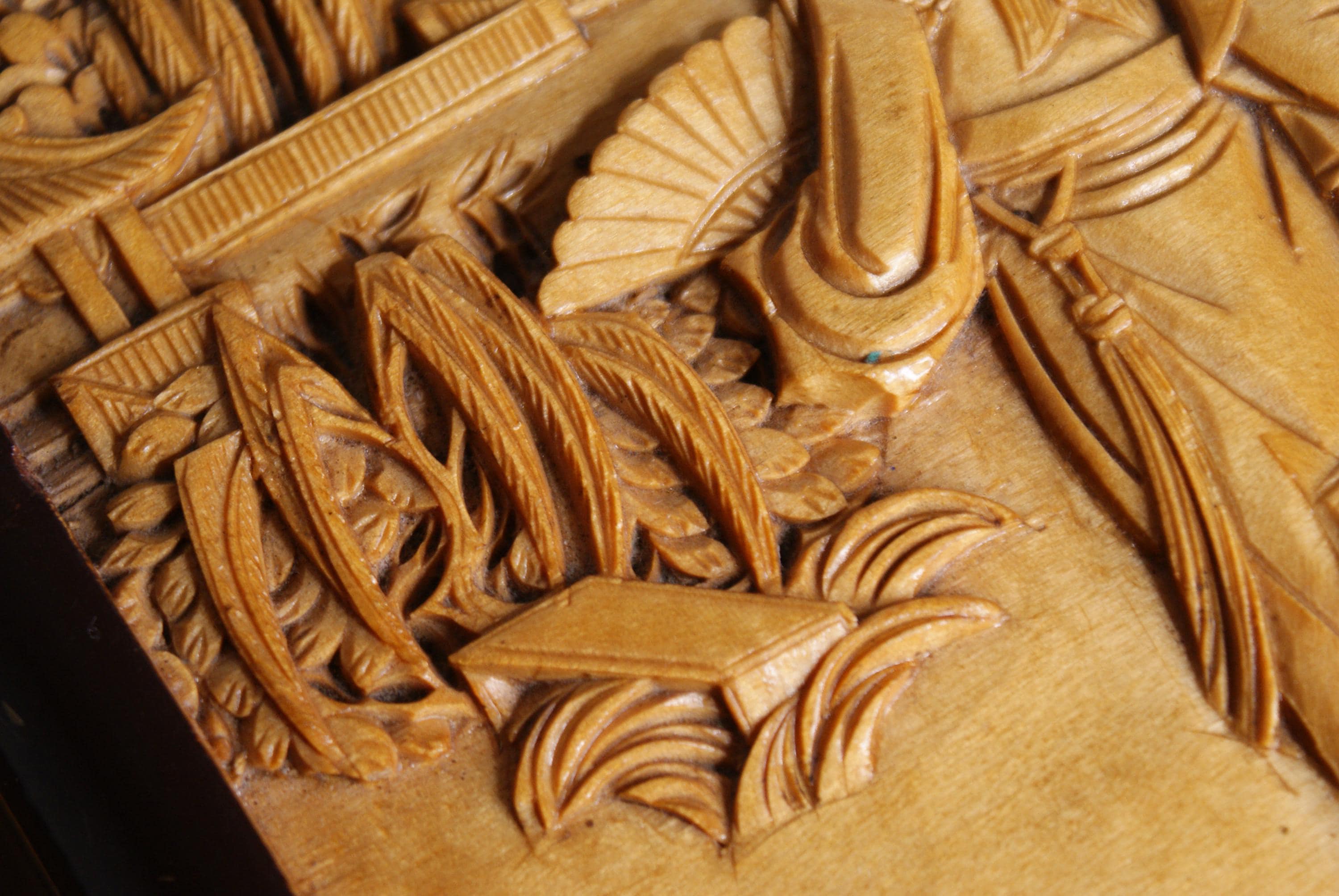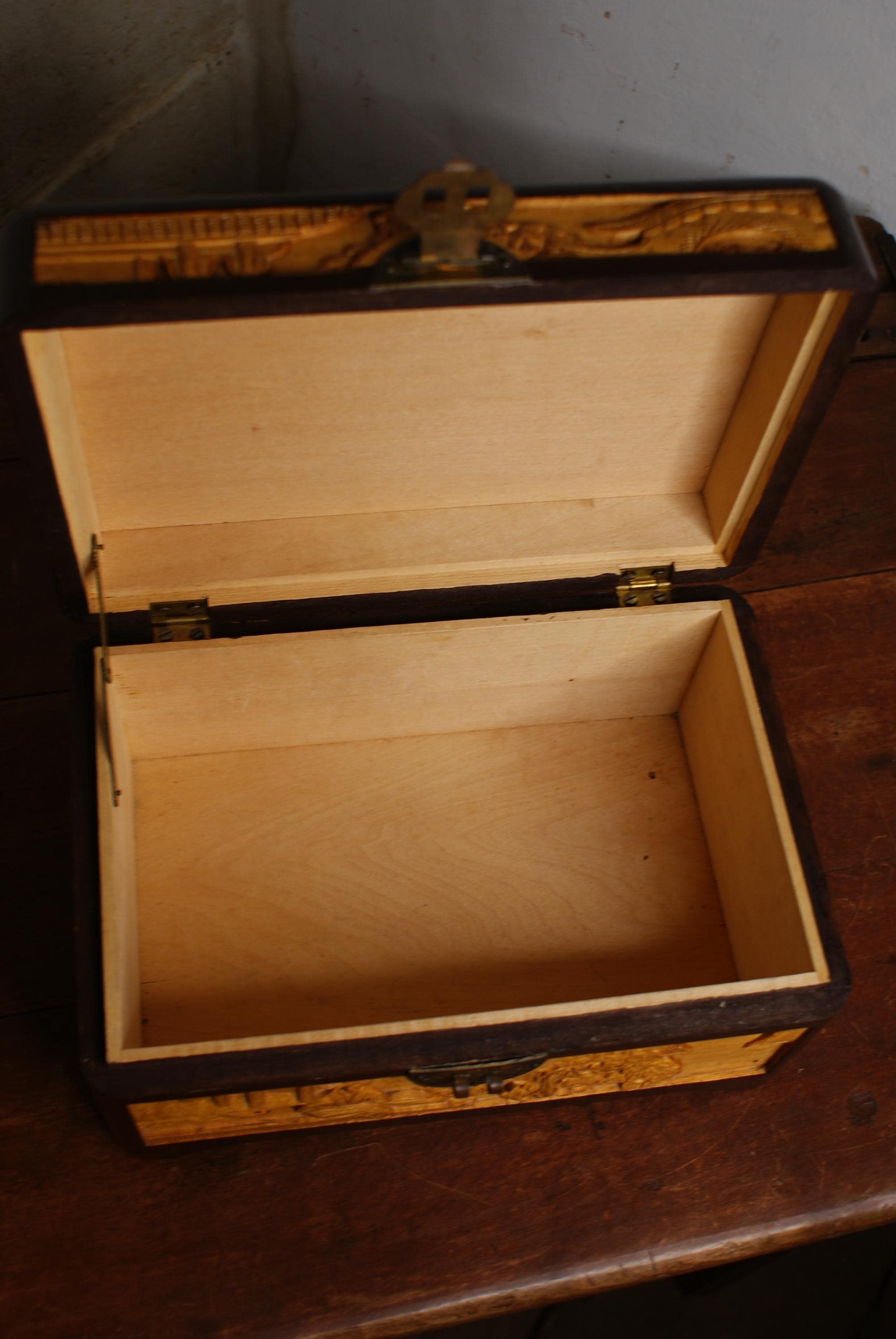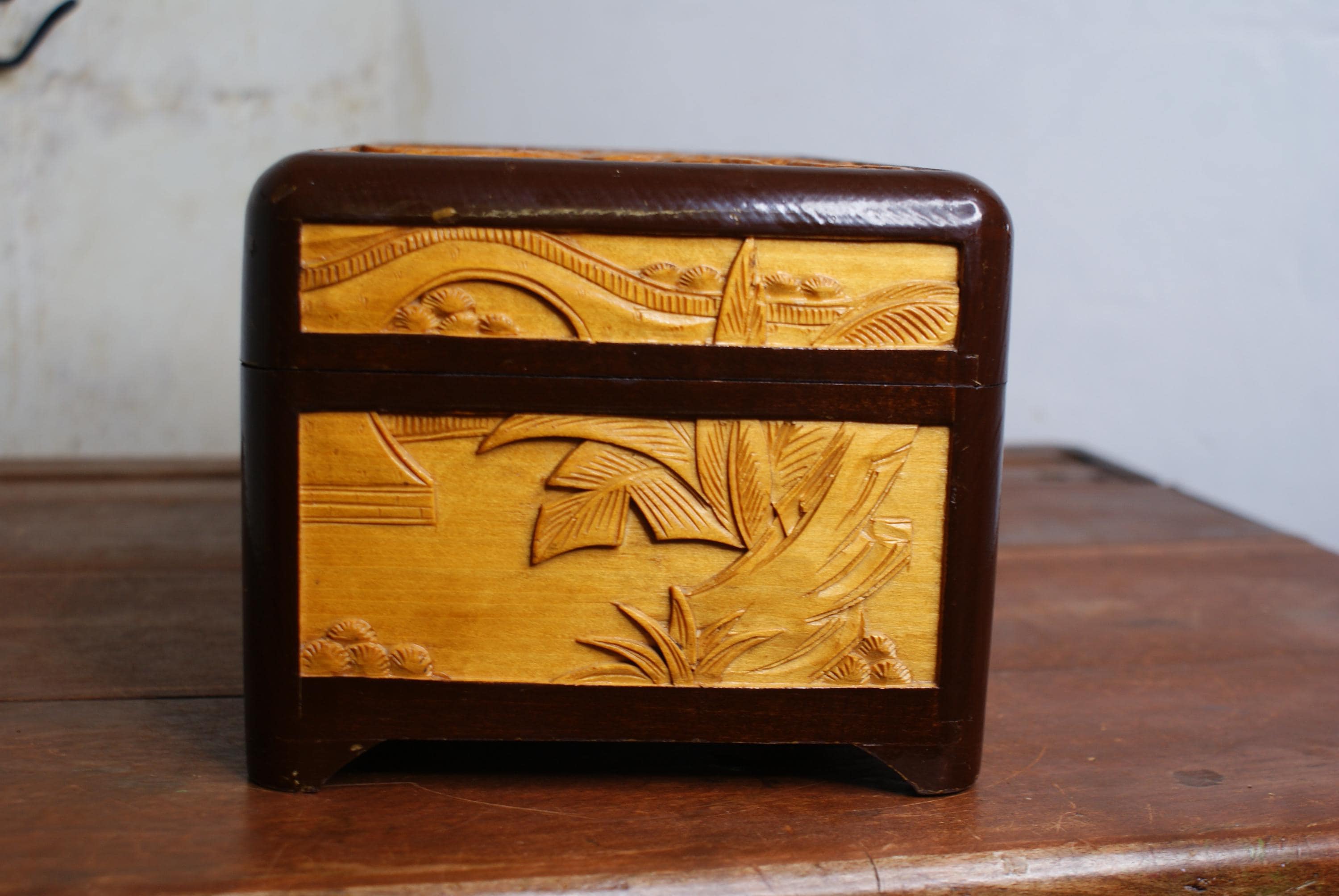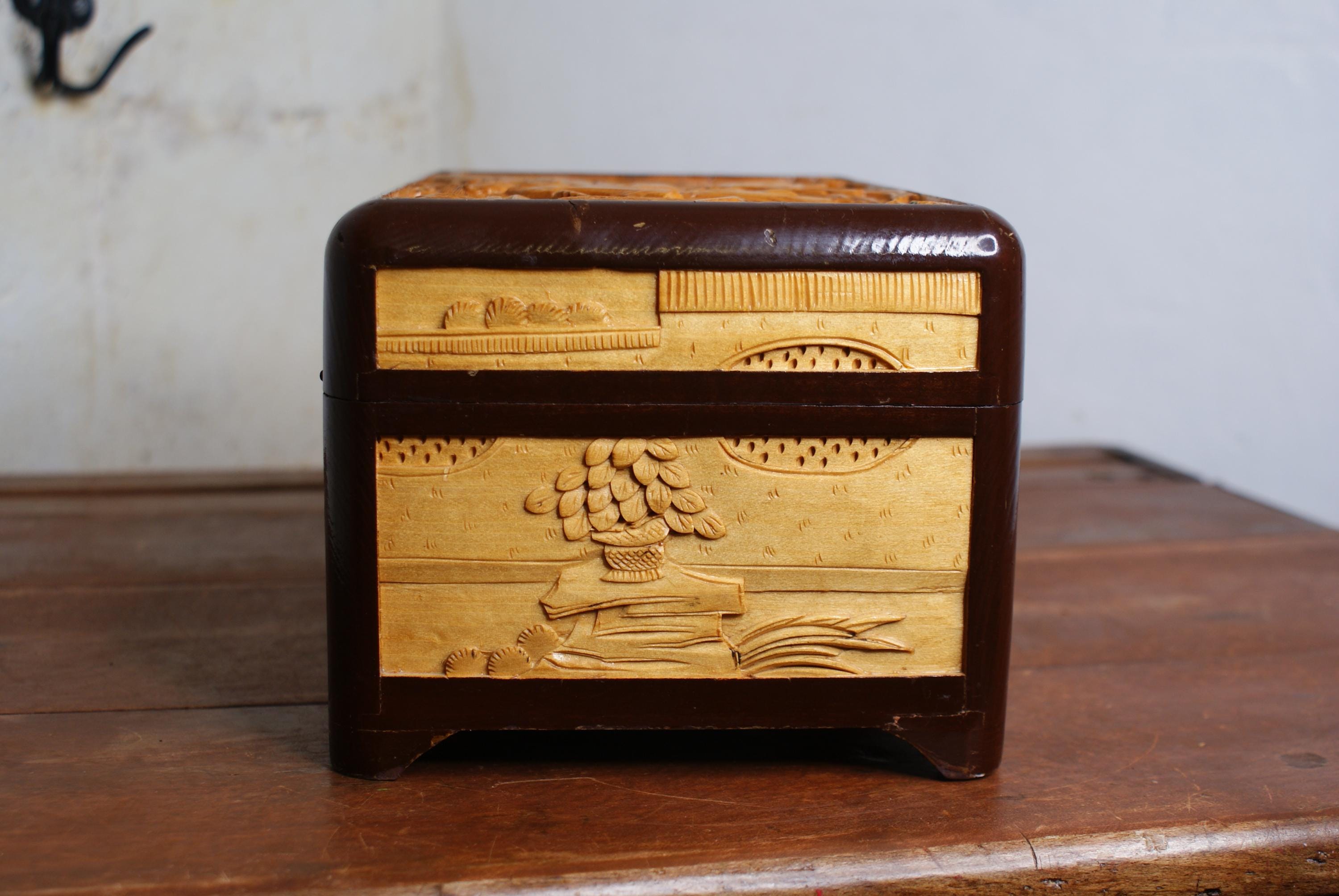 Stunning hand carved camphor box, in excellent condition with lovely high relief carvings.