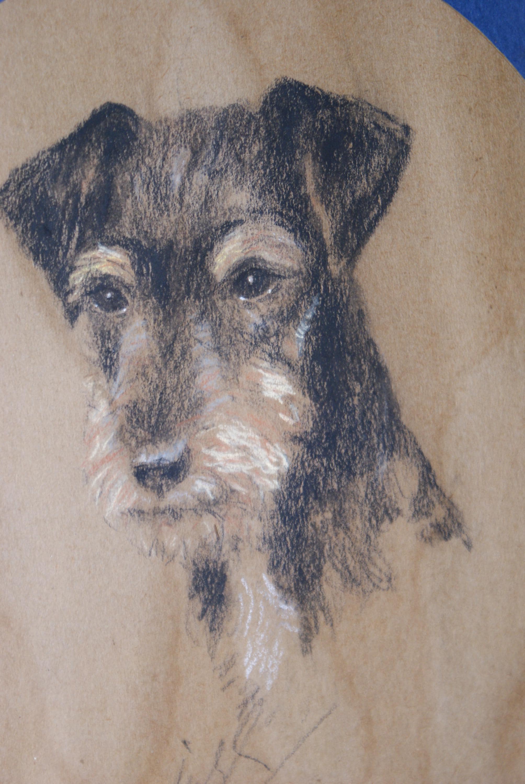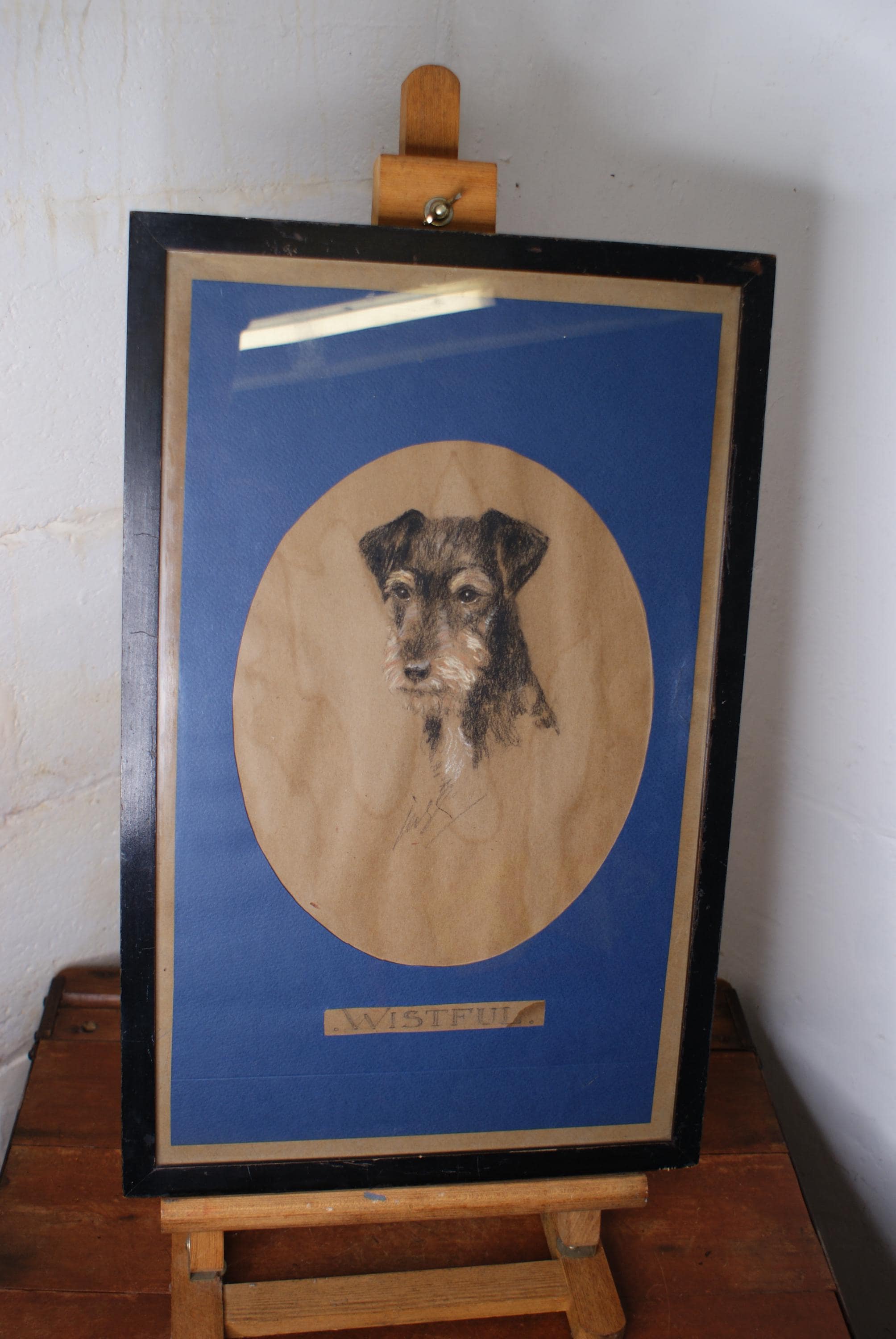 A lovely framed pencil drawing of a terrier dog, named wistful and signed its a lovely charming piece of wall décor. There is some water damage as can be seen in the photos, the frame is newer than the art.