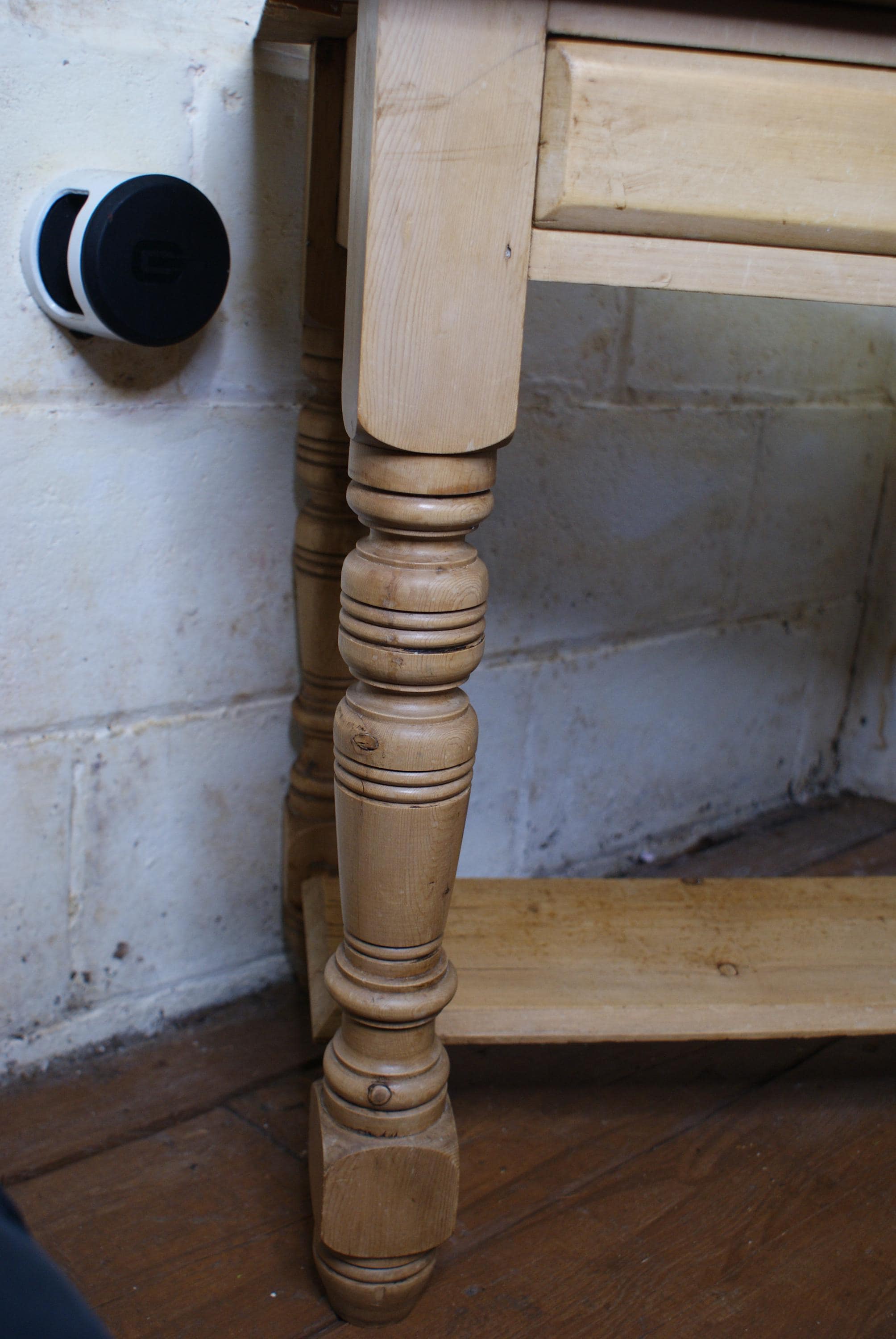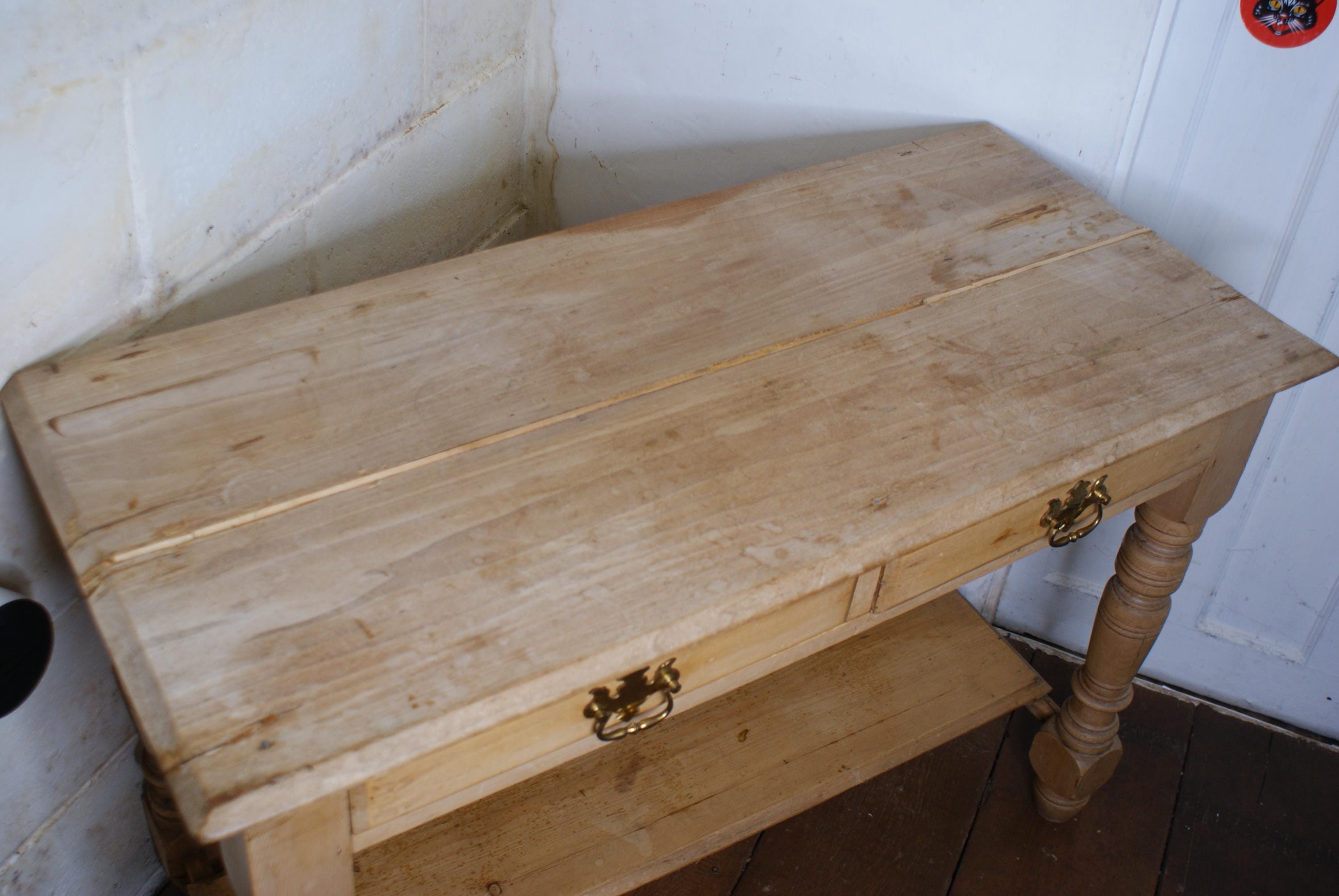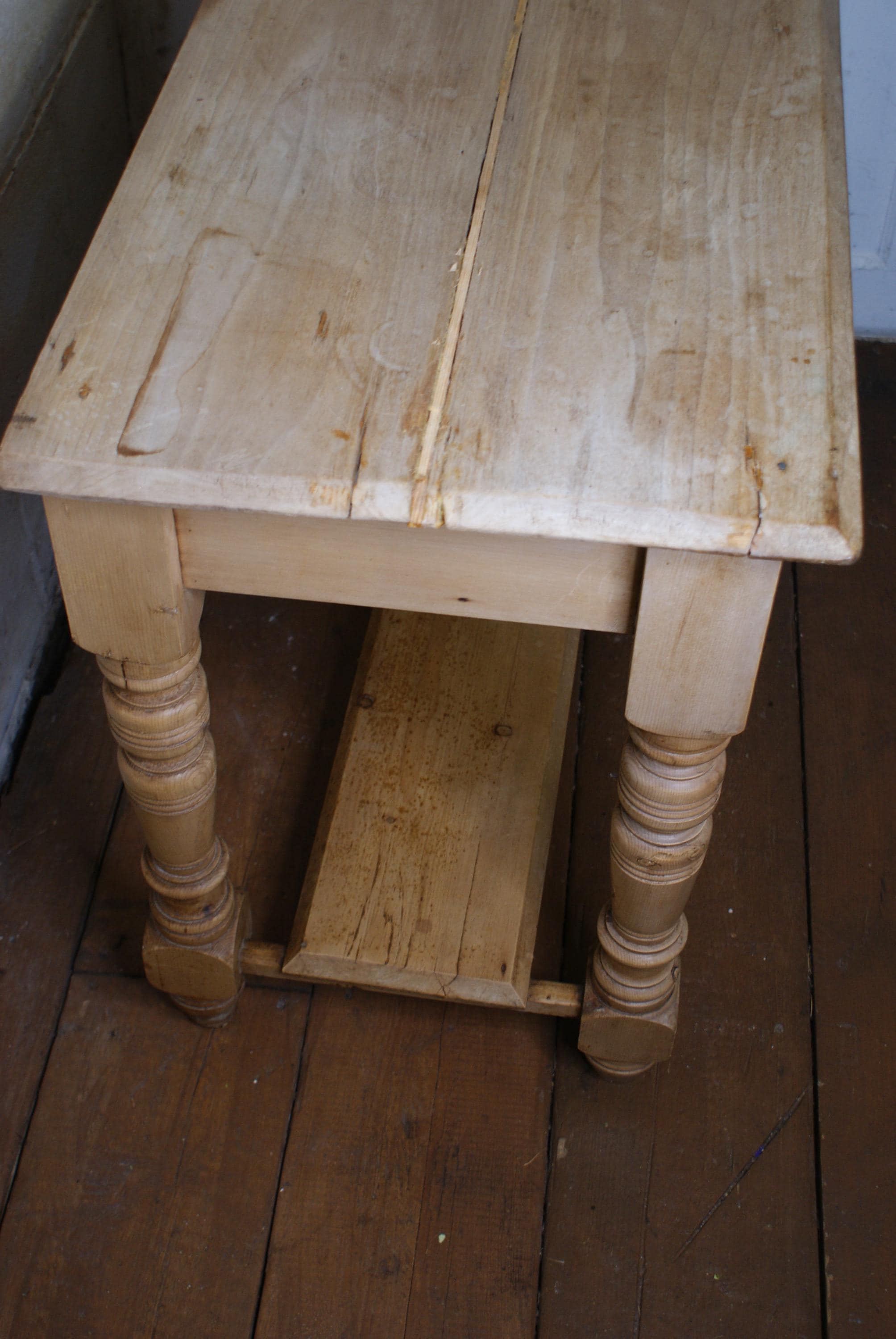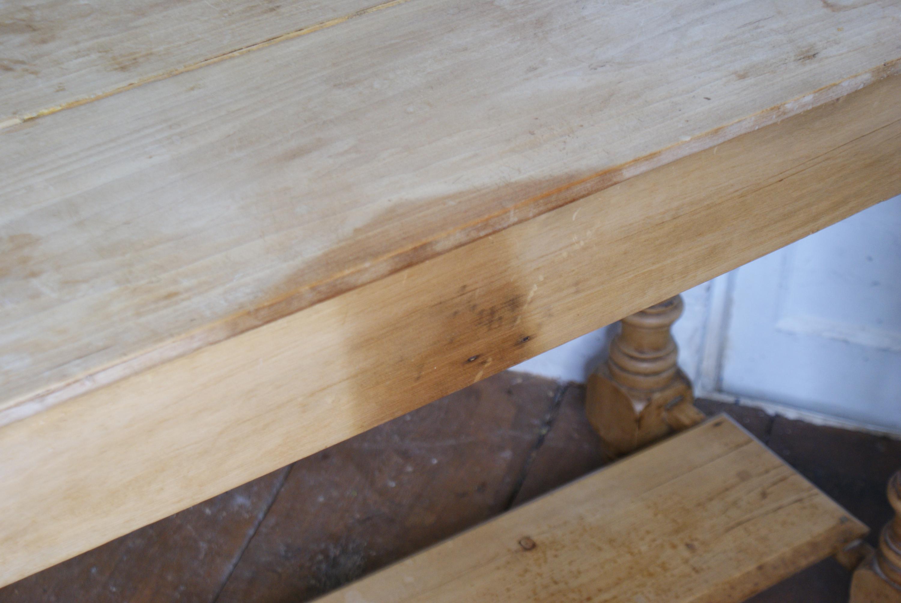 A fantastic rustic pine table, this is a lovely piece of rustic furniture. This has been a well used piece of functional furniture over many decades and shows signs of age and use, there is a very crude repair down the centre but I think this adds to the charm of this piece. some marks, stains and chips in line with age and heavy usage.