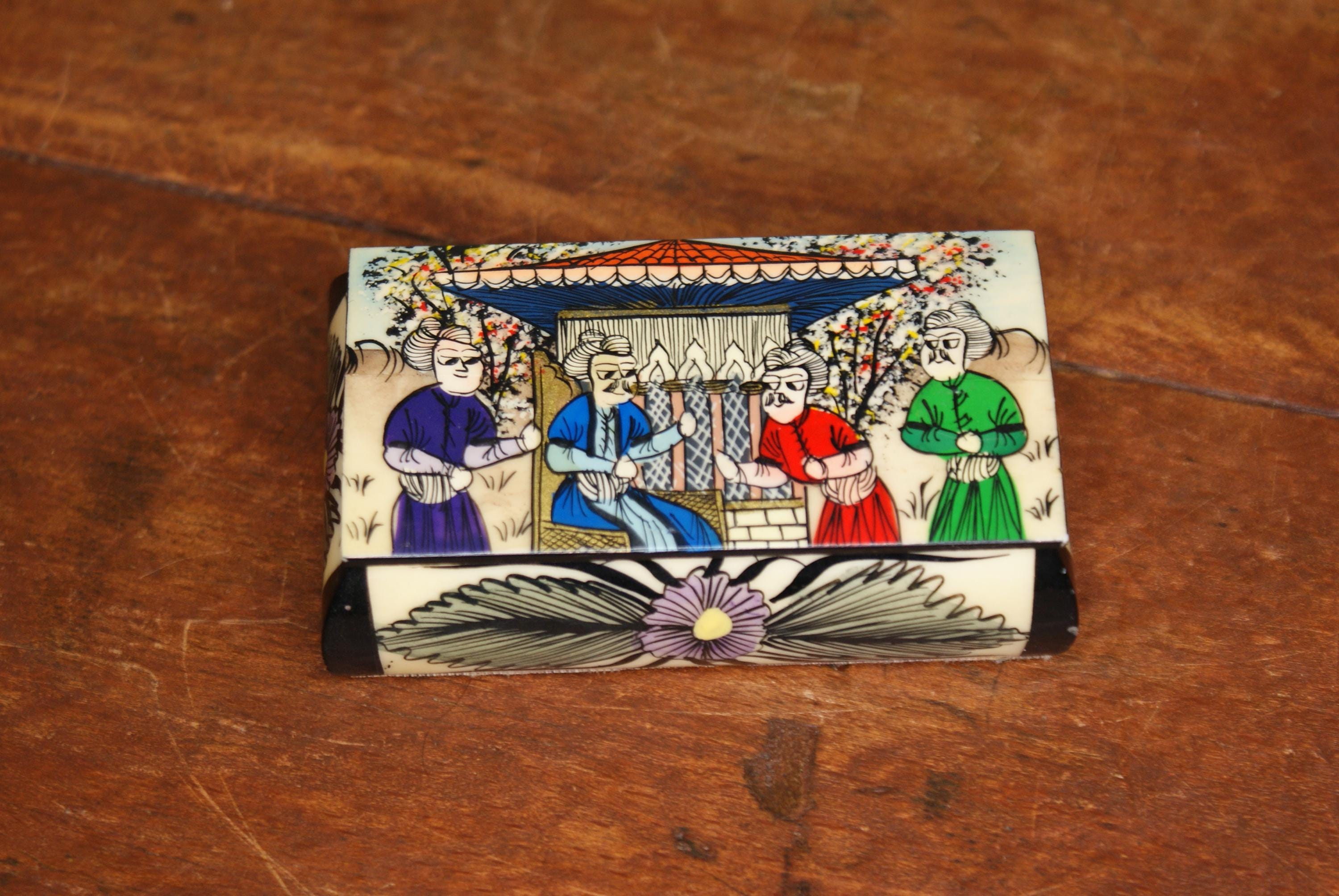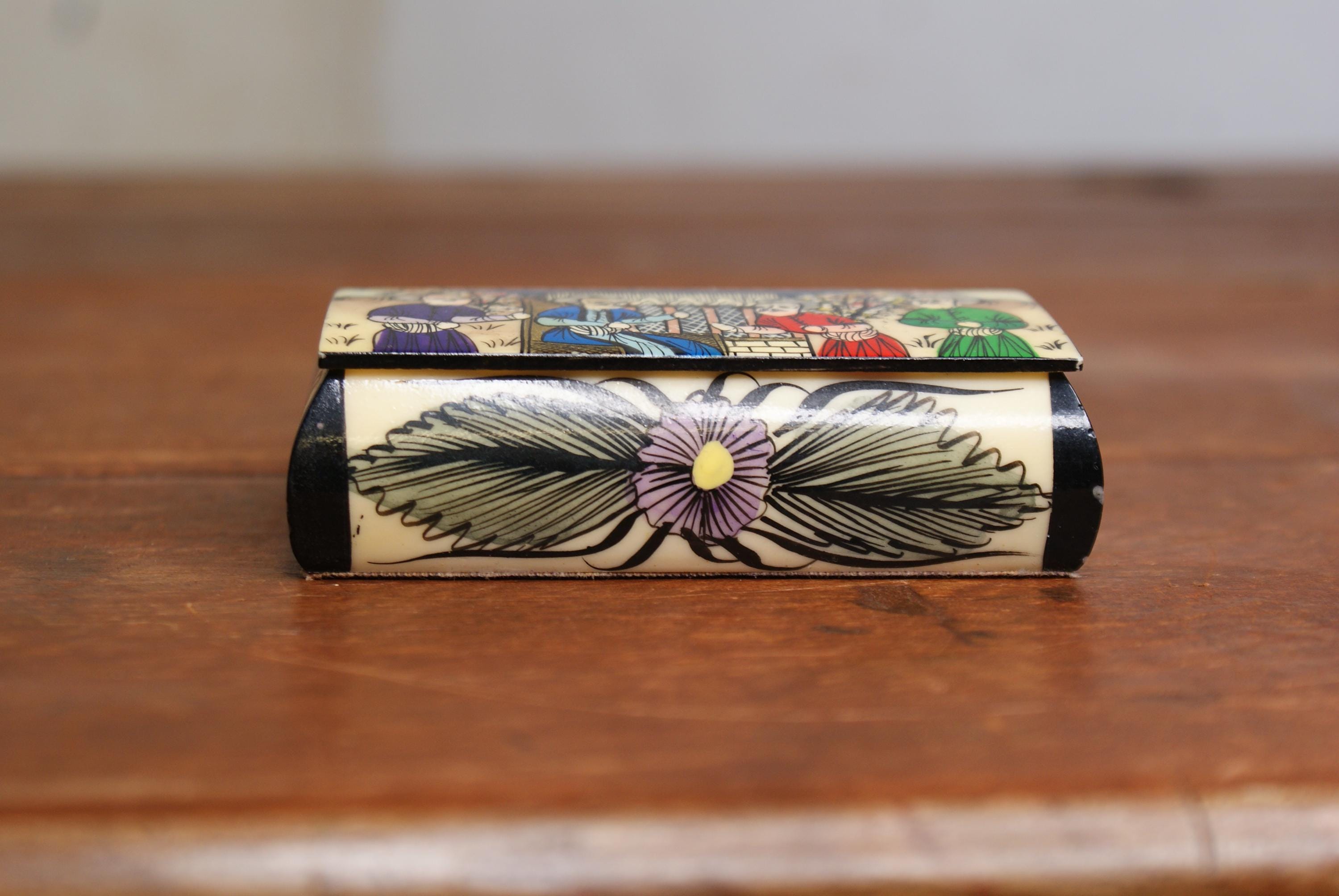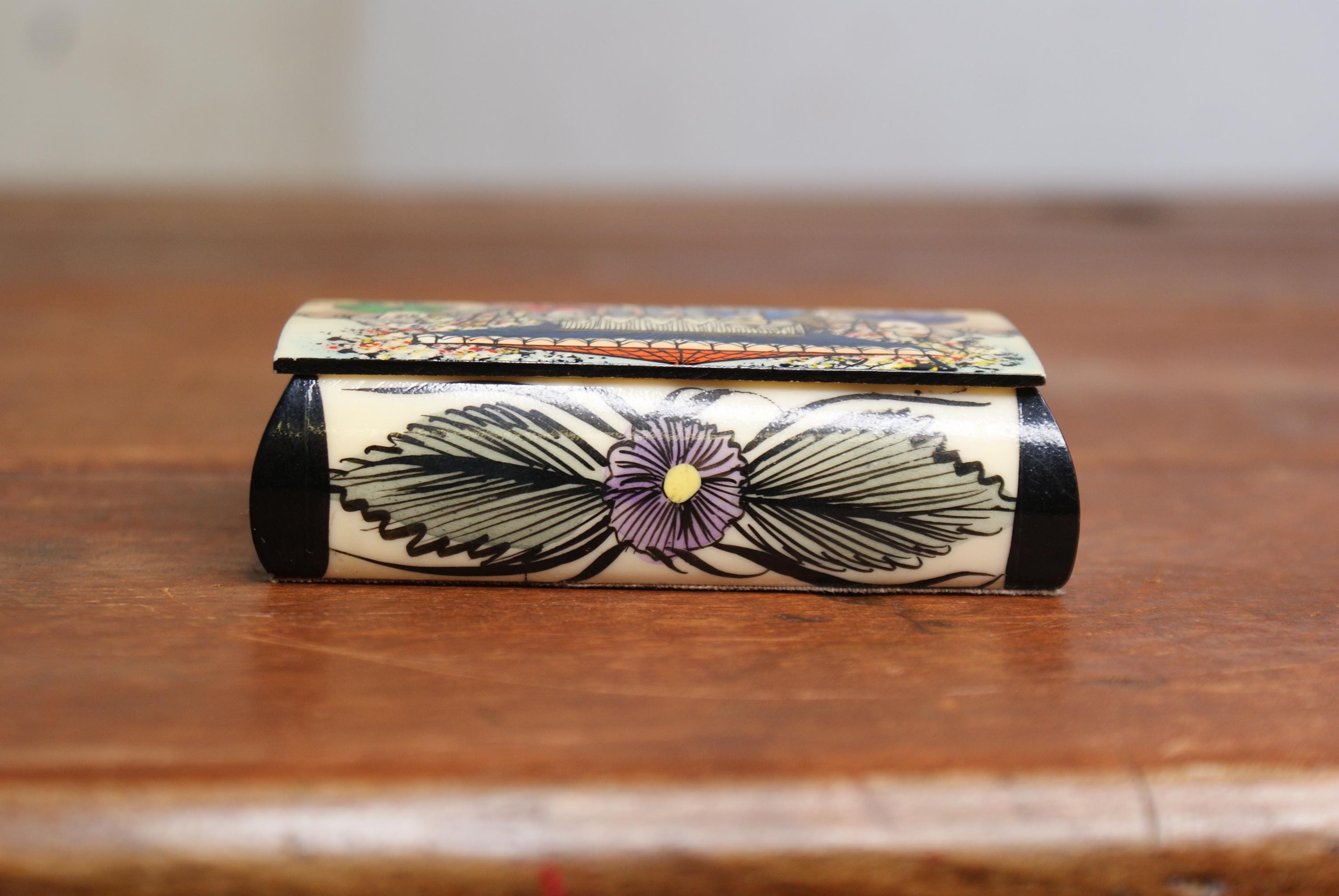 Lovely small hand painted bone trinket box. This features a lovely colourful hand painted design.