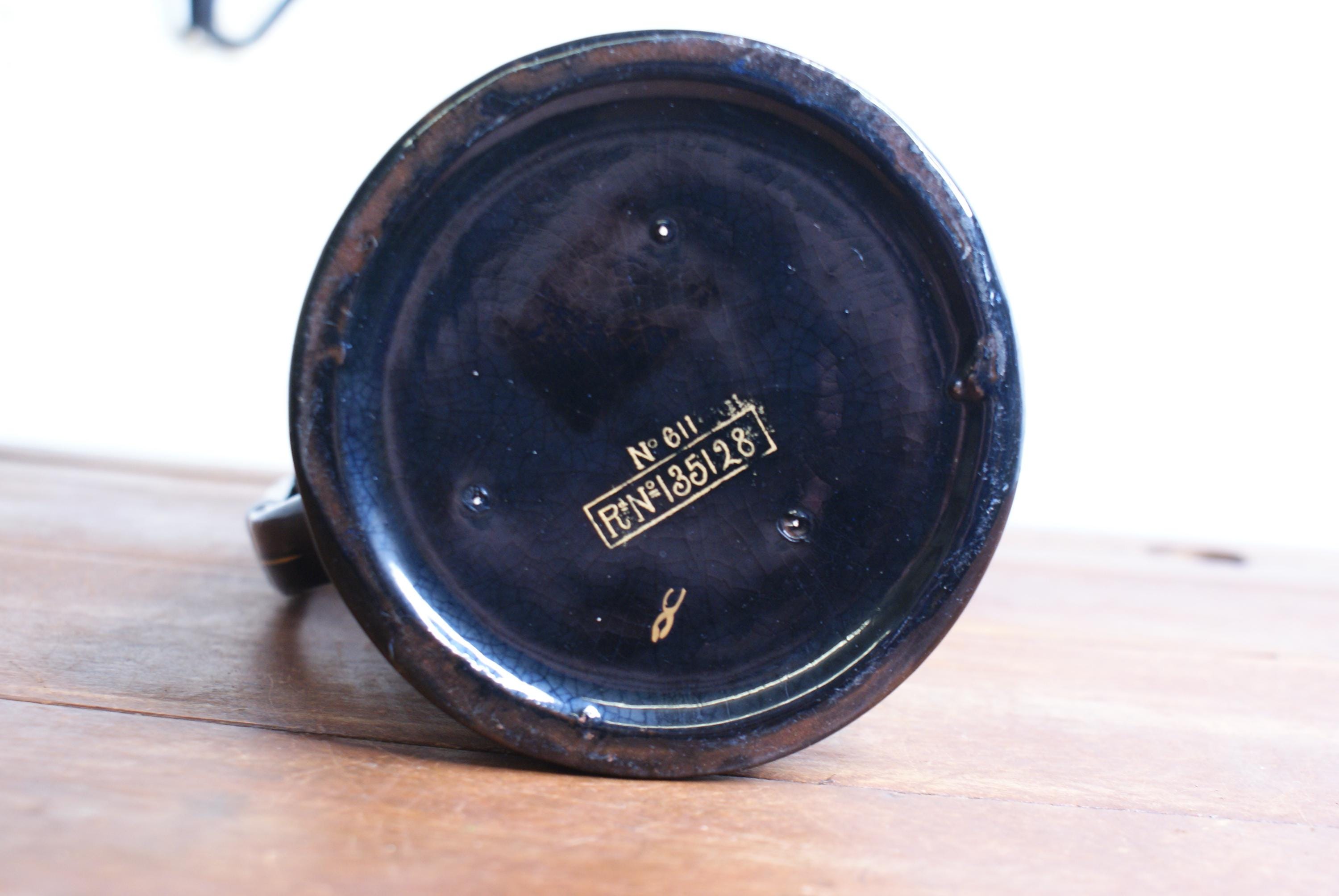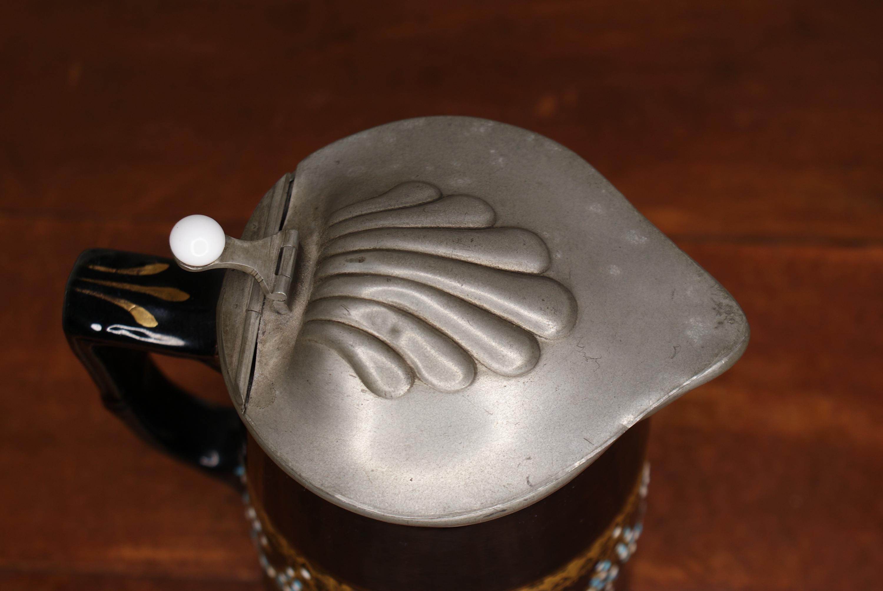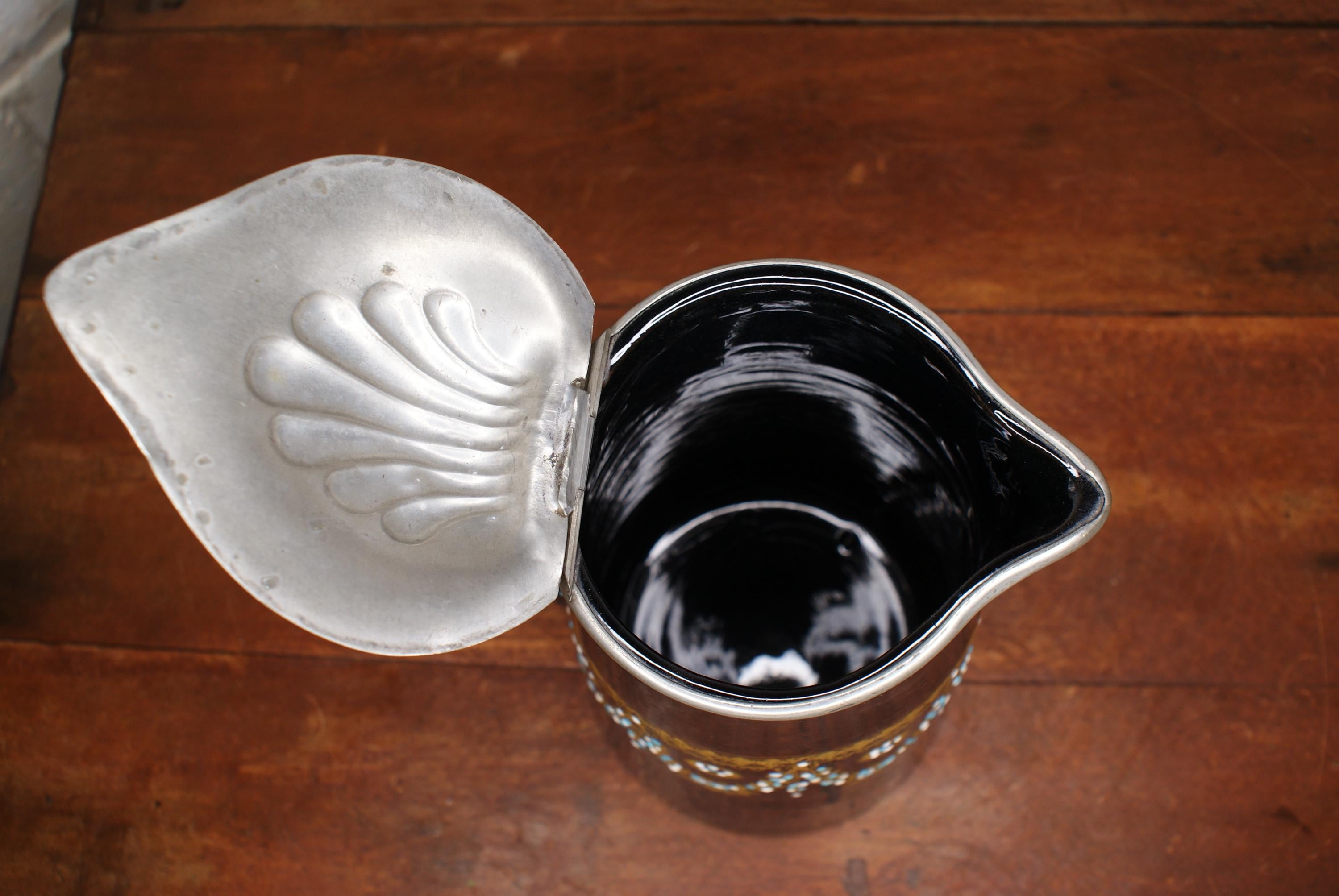 Woods Brown Luster Redware Enamelled and Pewter Top Syrup Pitcher