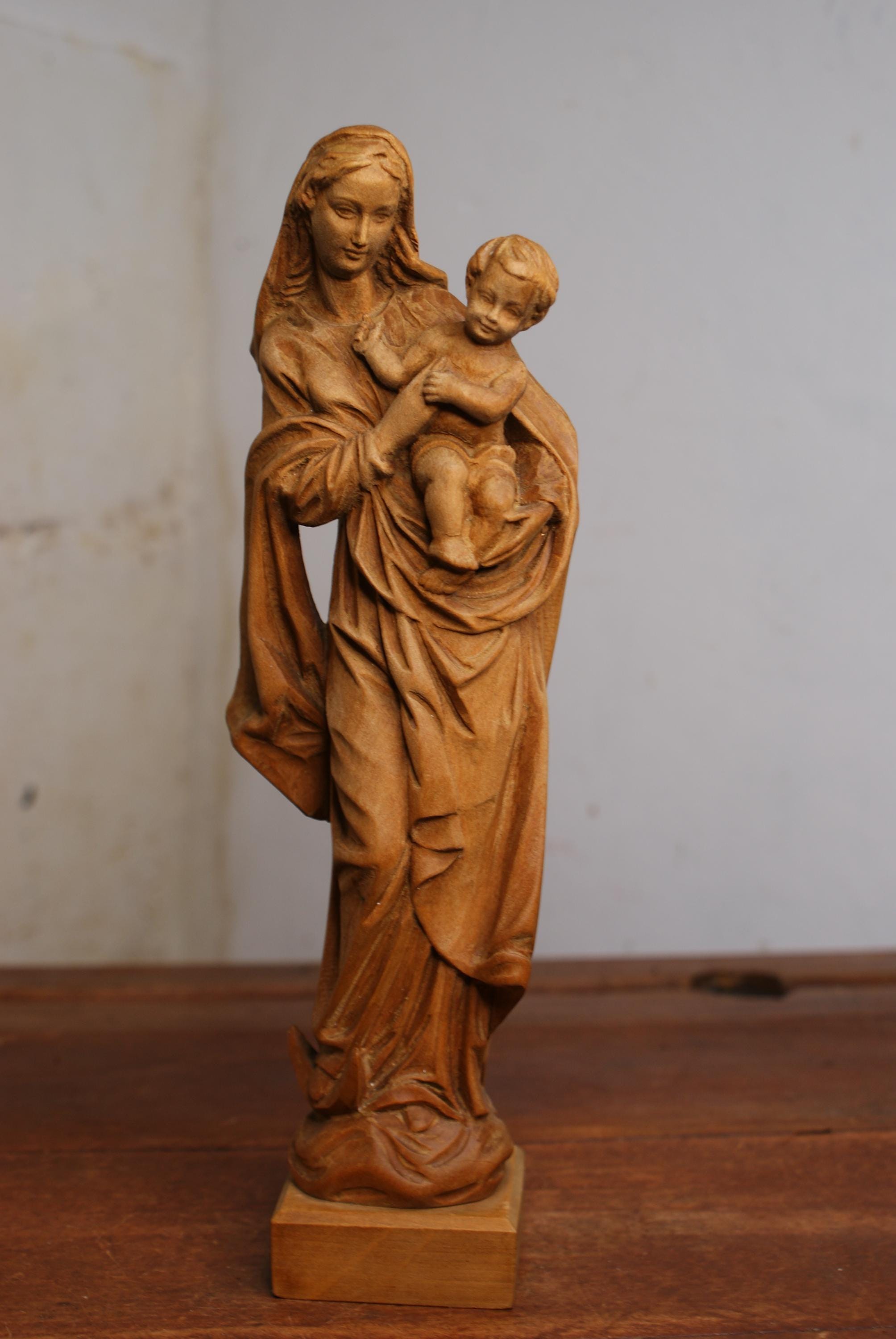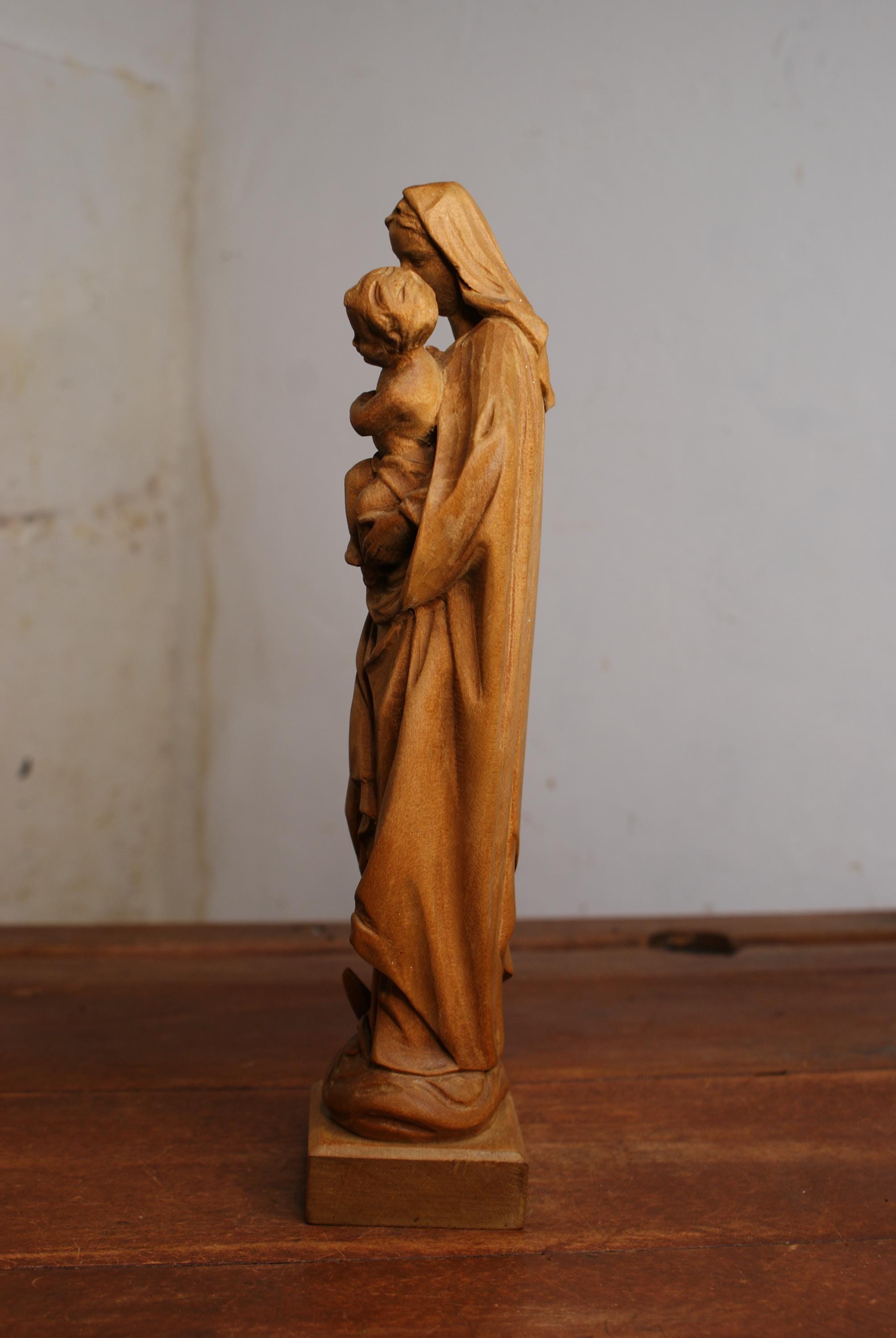 A lovely vintage mid century wood carving af the VirginMary with child. Made by W.u M Heinzeller in Oberammergau, Germany an area renowned for its wood carvings and folk art for over 500 years.