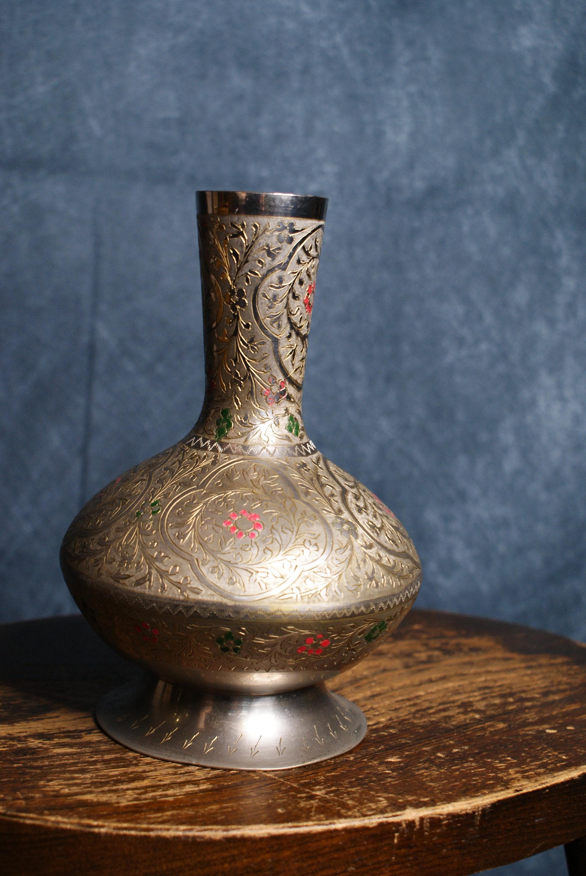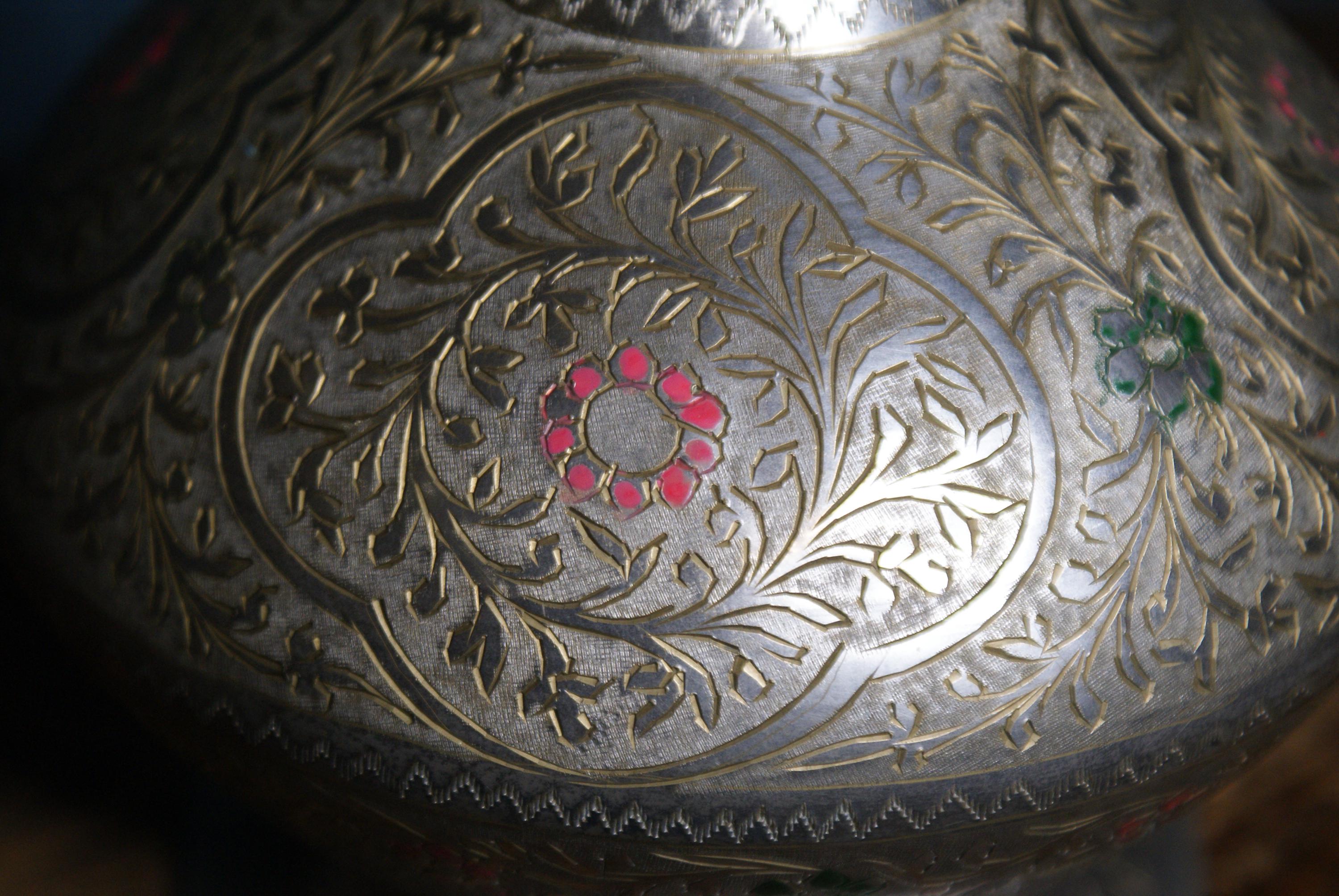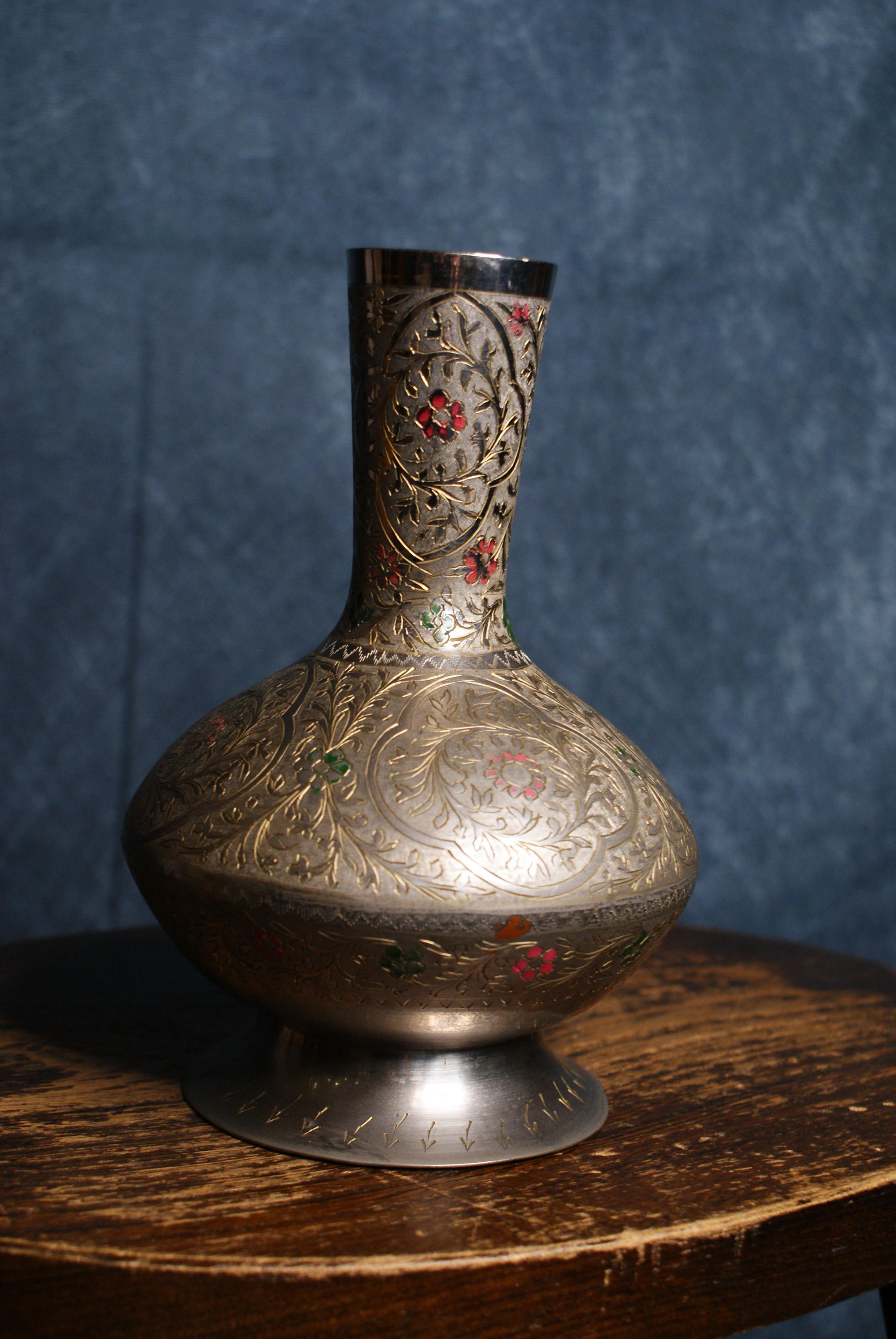a lovely metal Indian vase, A lovely engraved design and hand painted accents.