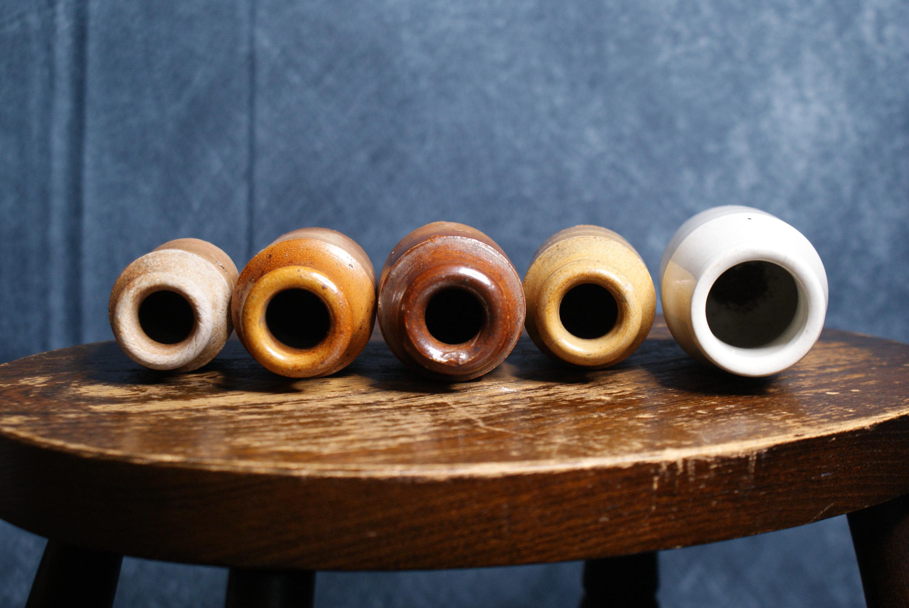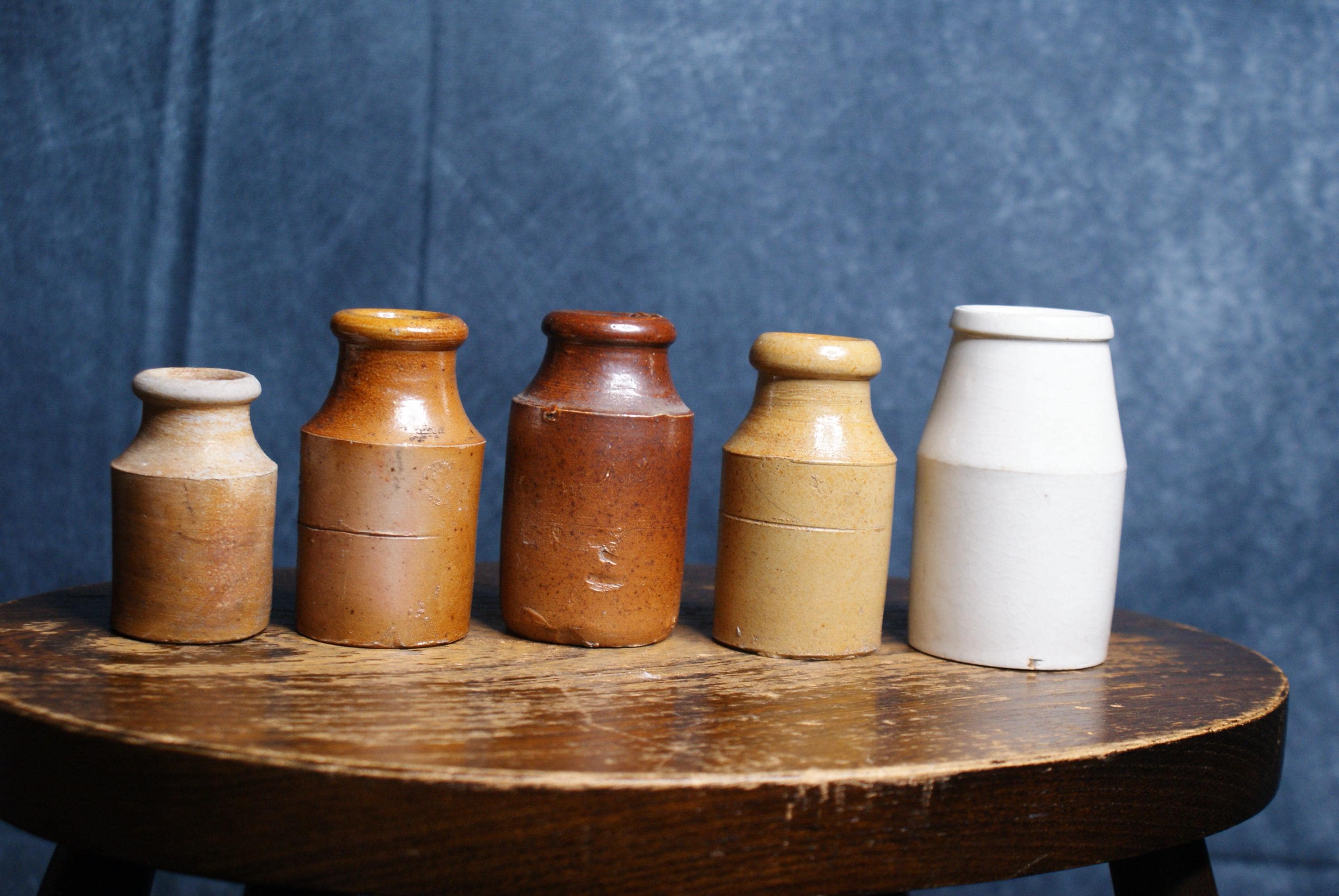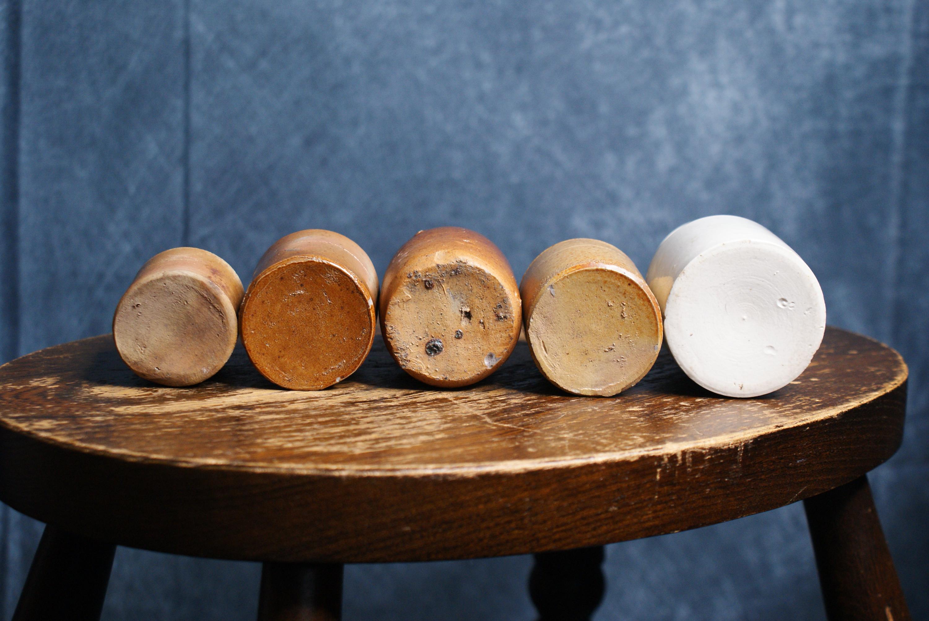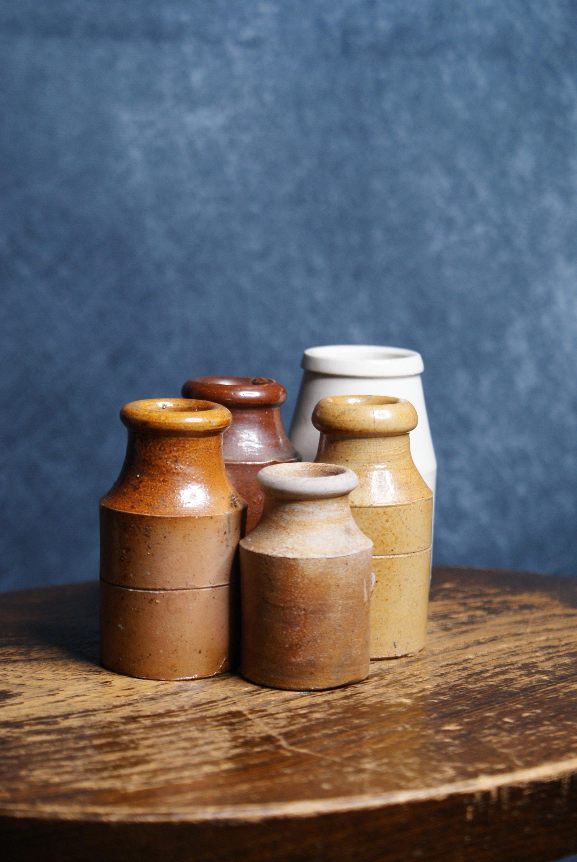 A lovely collection of 5 stoneware ink pots dating to the early 20th century. Price shown is for the set of 5. Measurements range from 6 - 9cm in height.