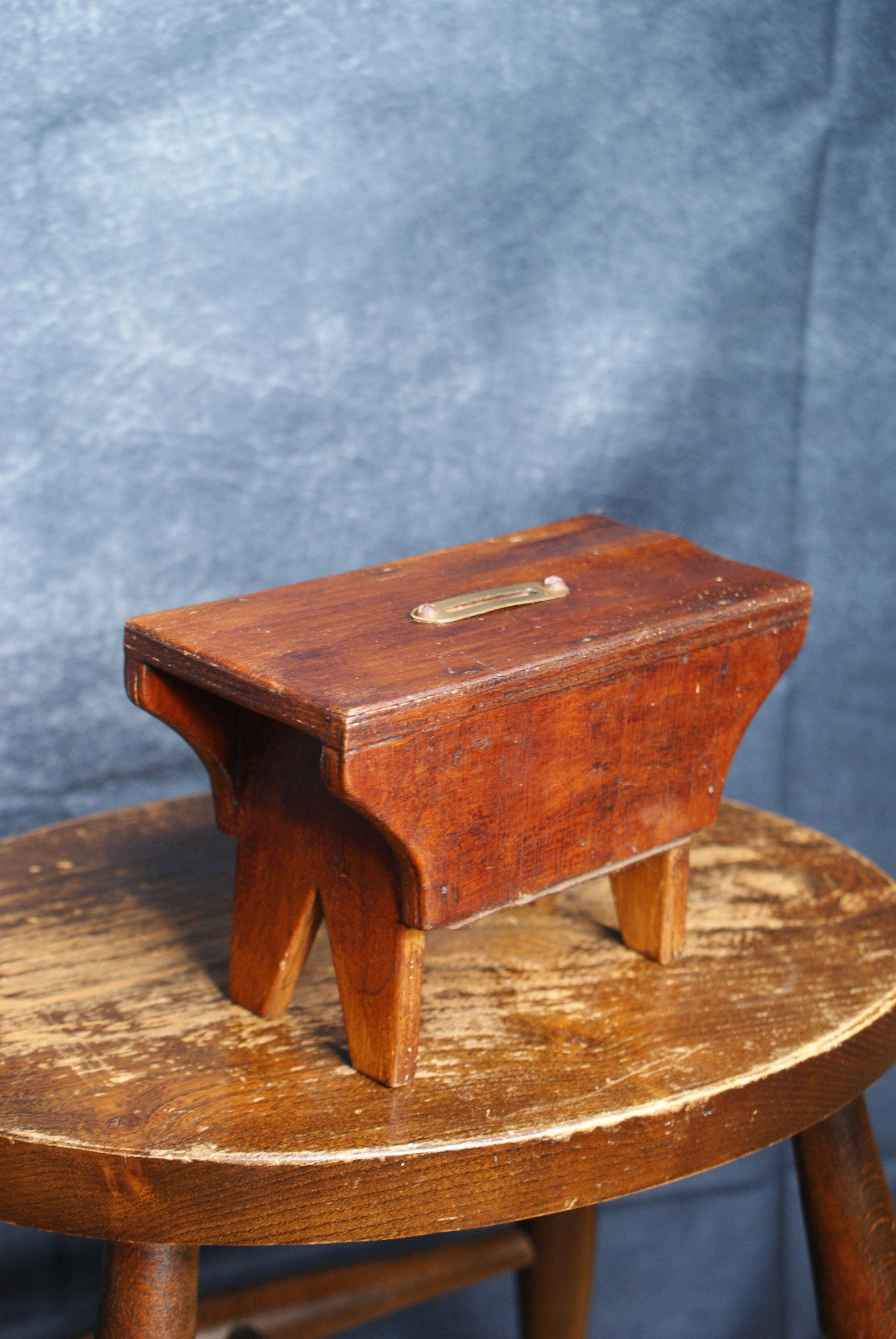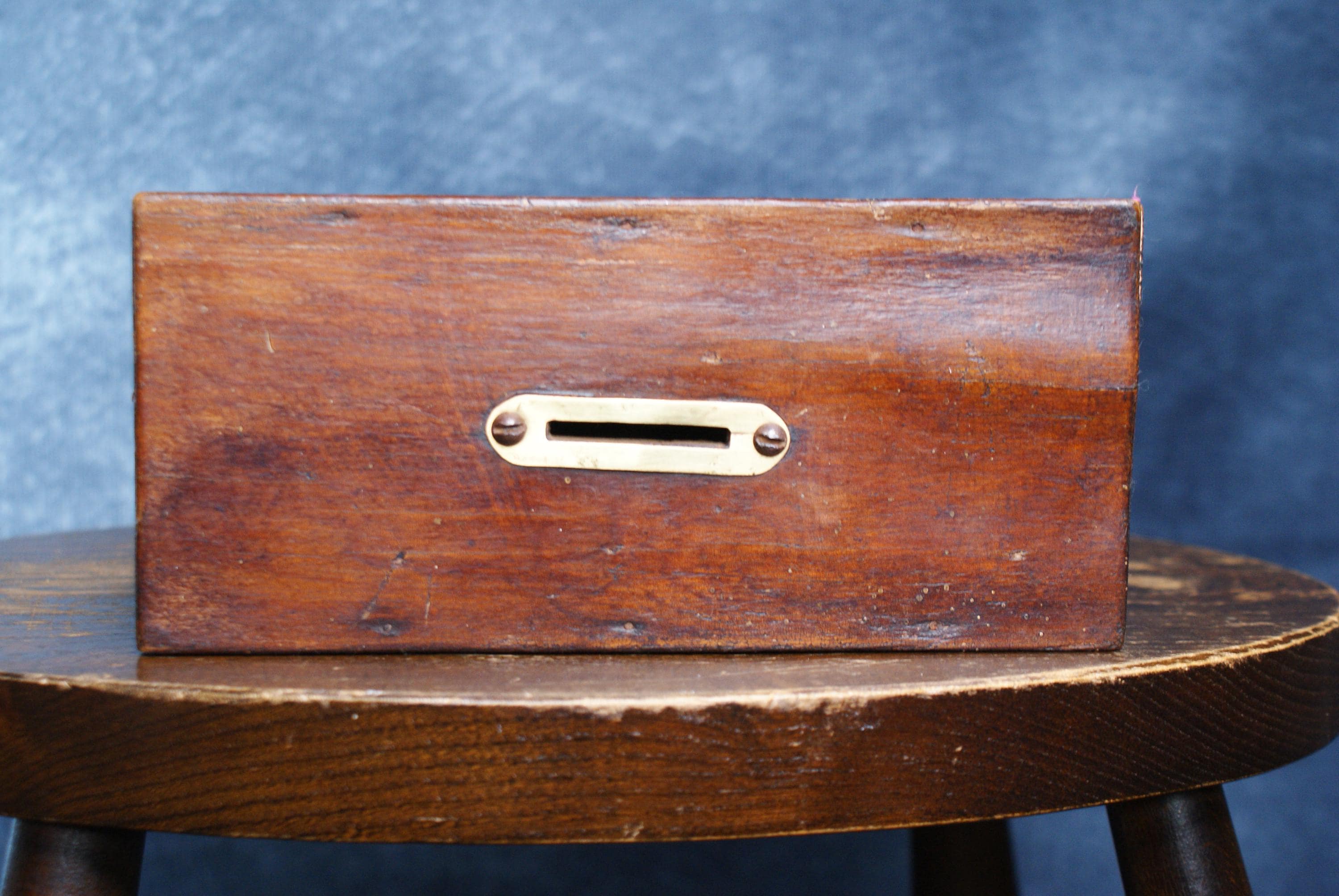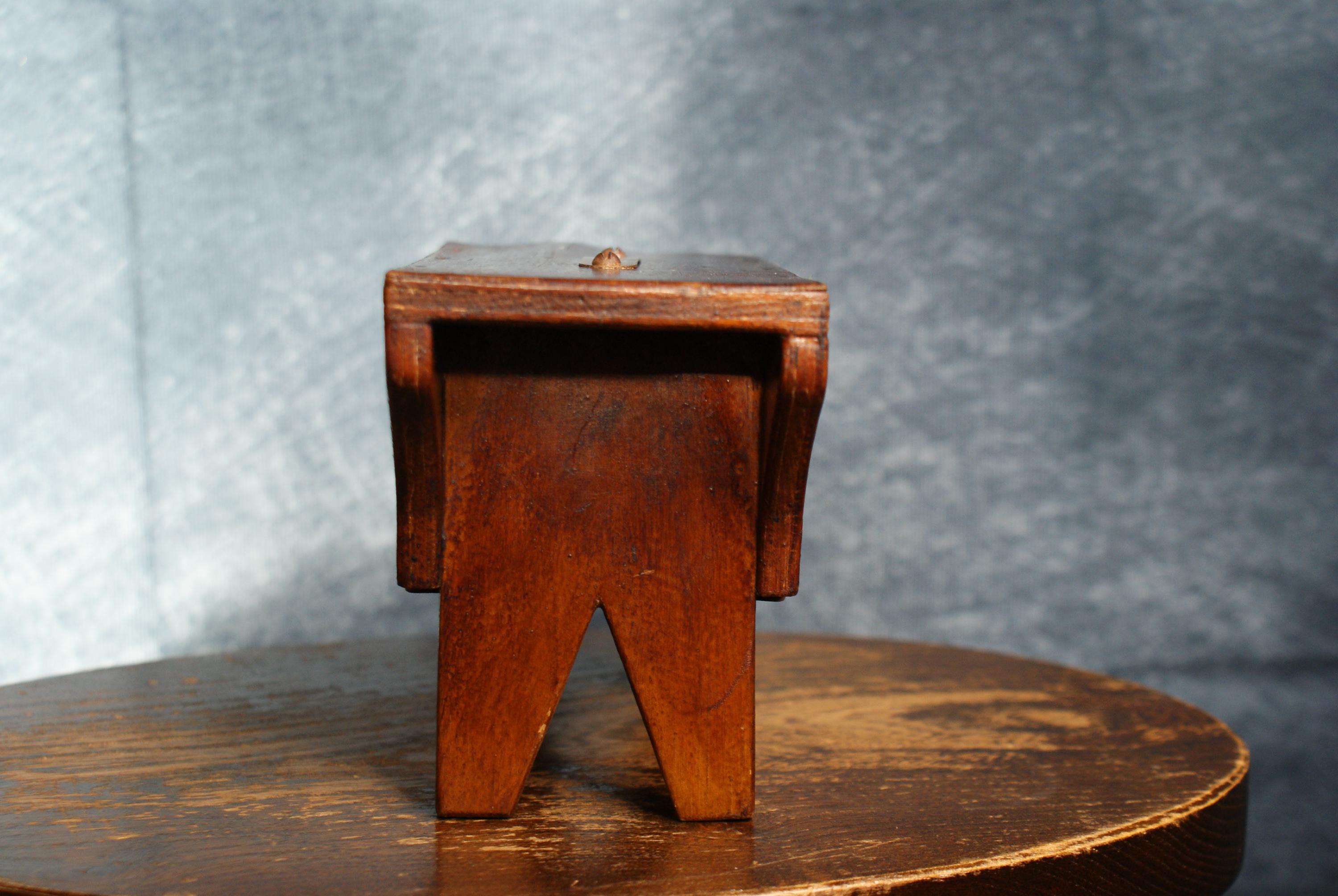 A Lovely handmade cracket stool money box, Likely 19th century an in excellent condition. There is a slight bubble to the wood on one side that can be seen in the pictures.