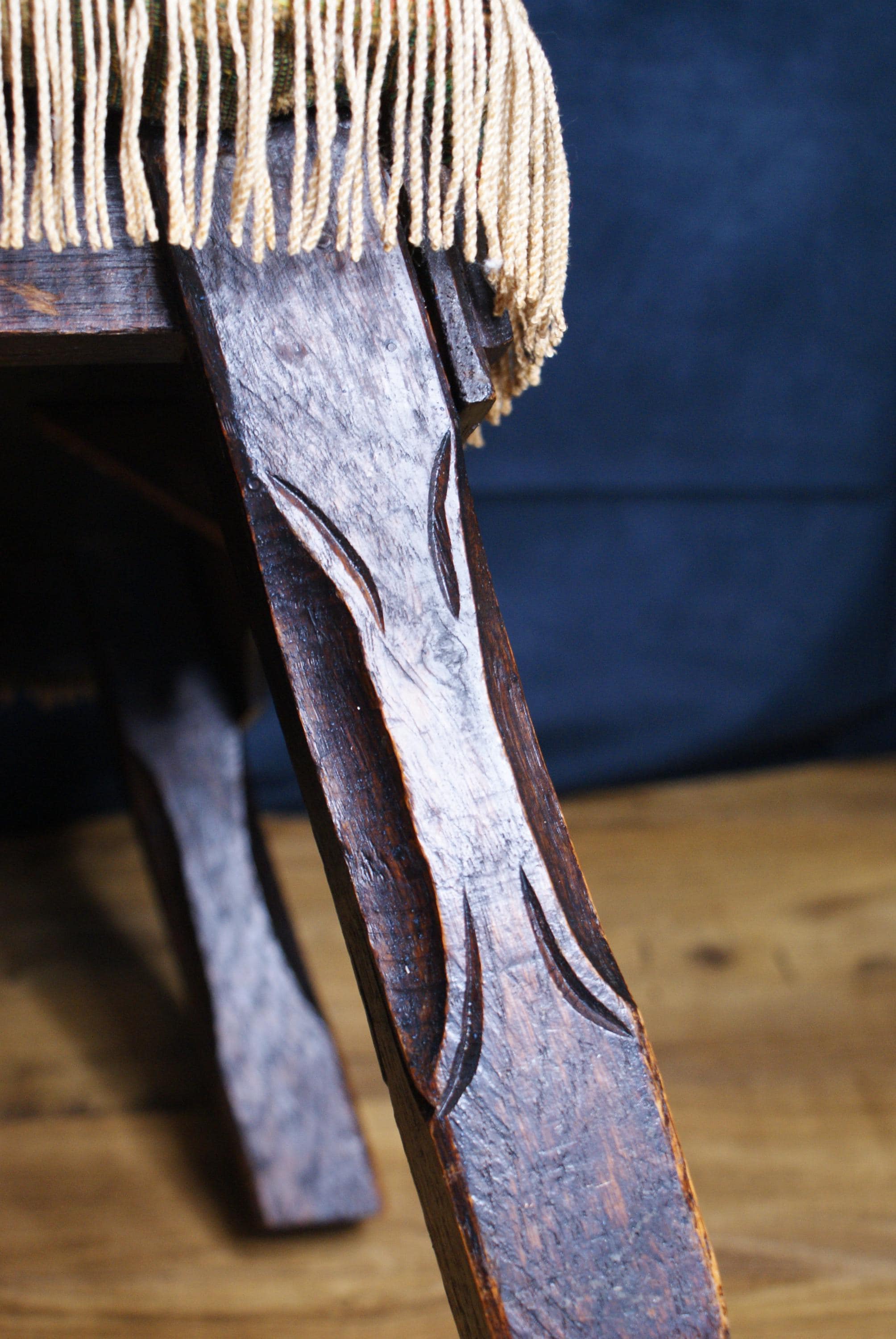 A Lovely foot stool with carved legs and a needlepoint tapestry style covering. in excellent condition. The current covering is a newer addition as you can see there is a green leather covering underneath.
