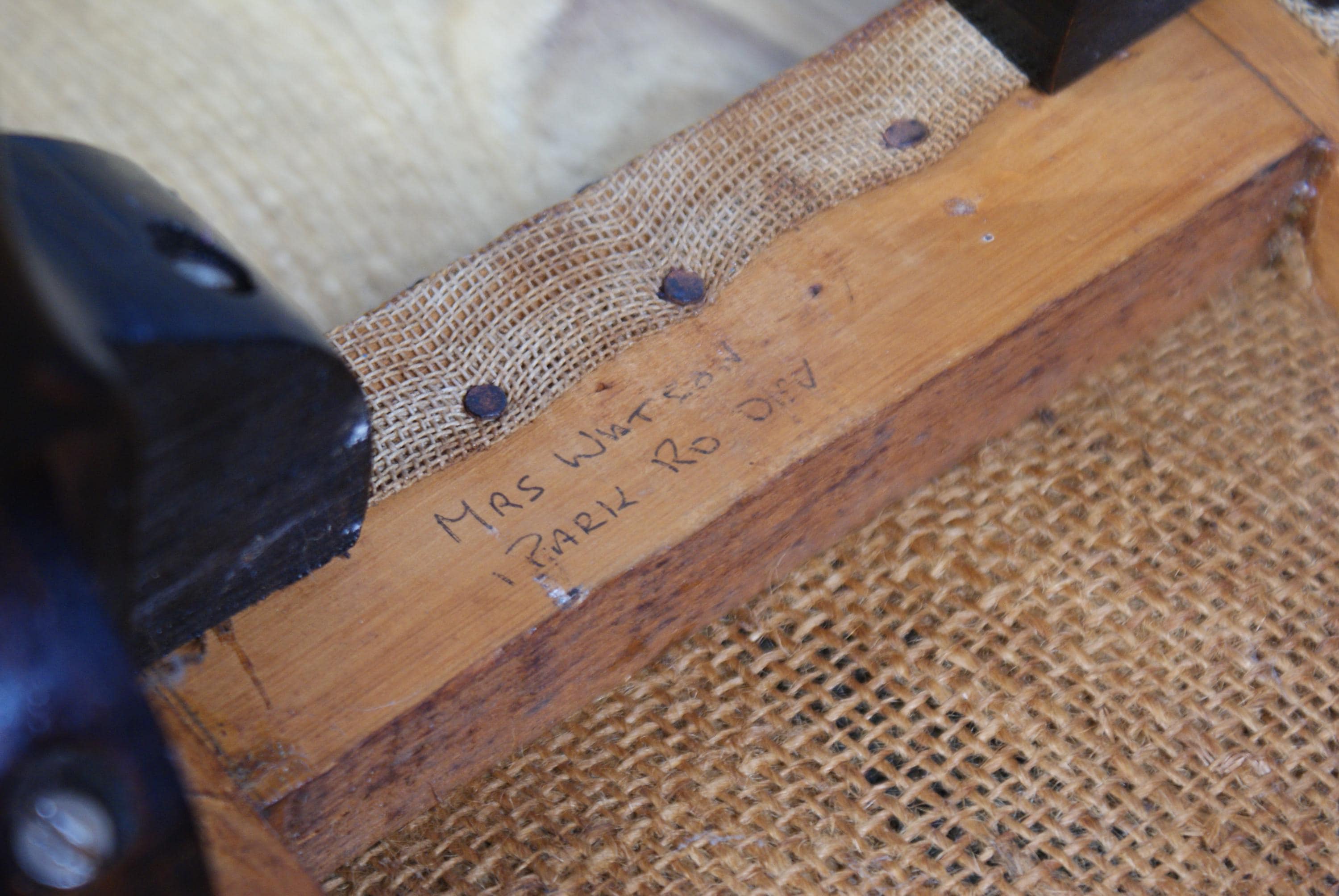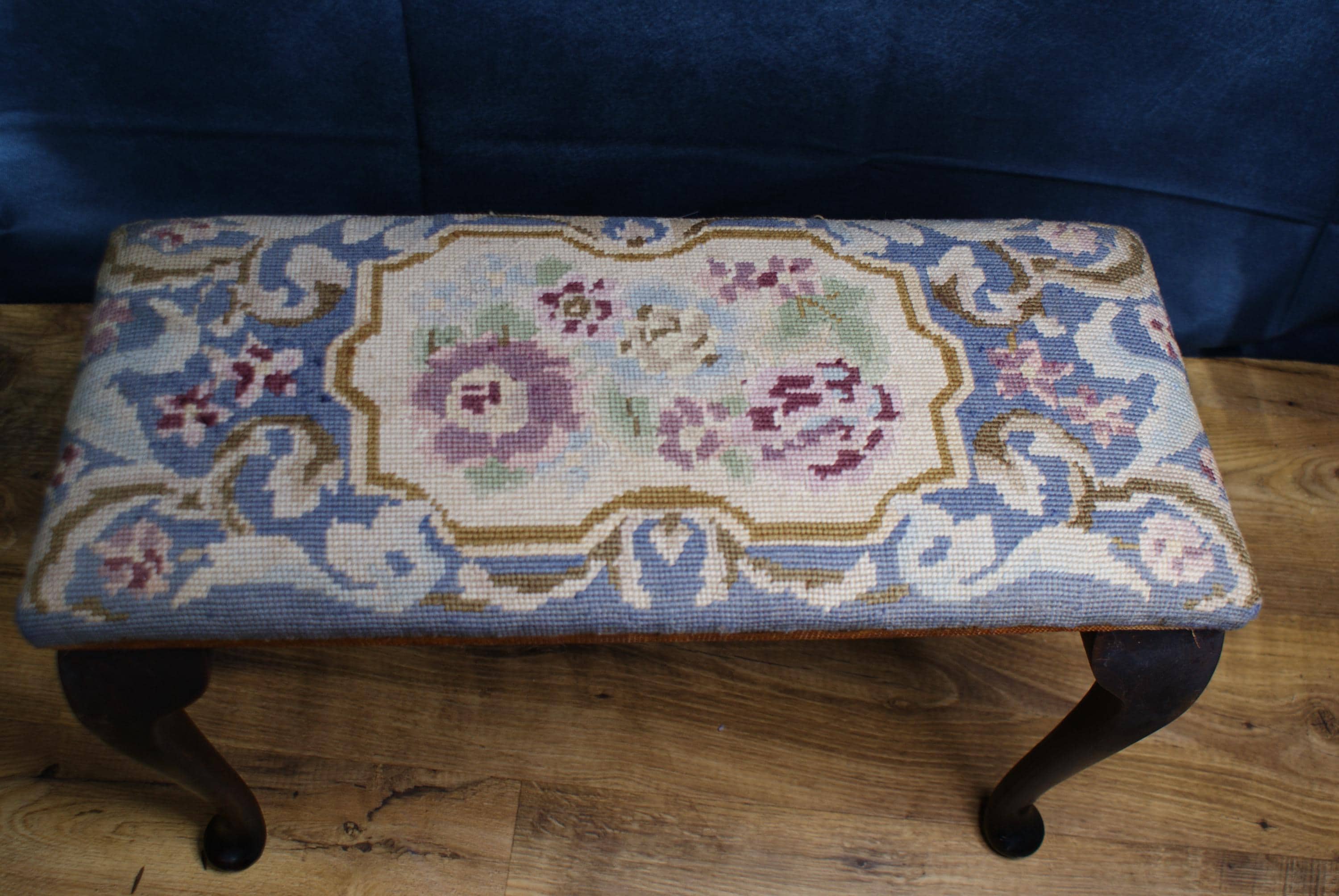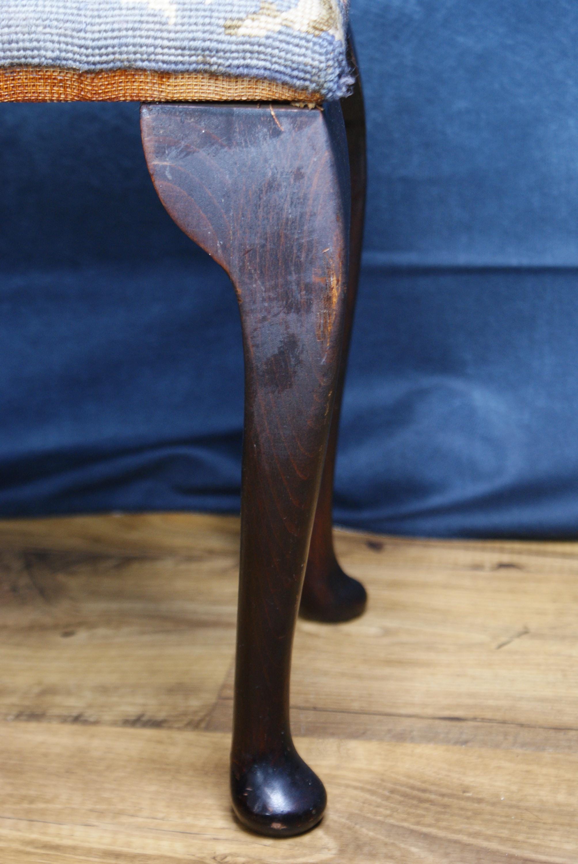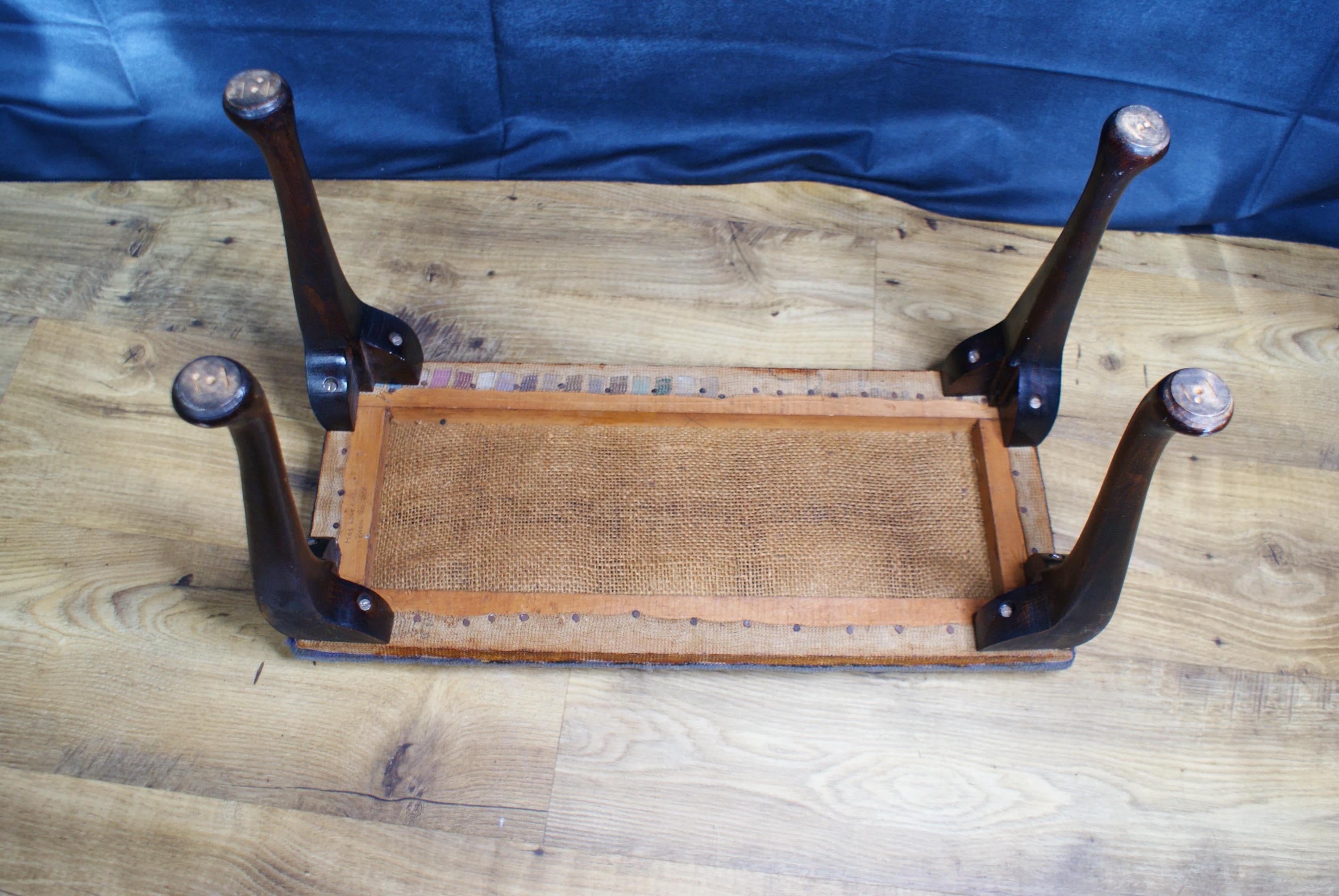 A lovely foot stool with cabriole legs and a needlepoint covering. There is a name written on the bottom possibly the customer it was made for.