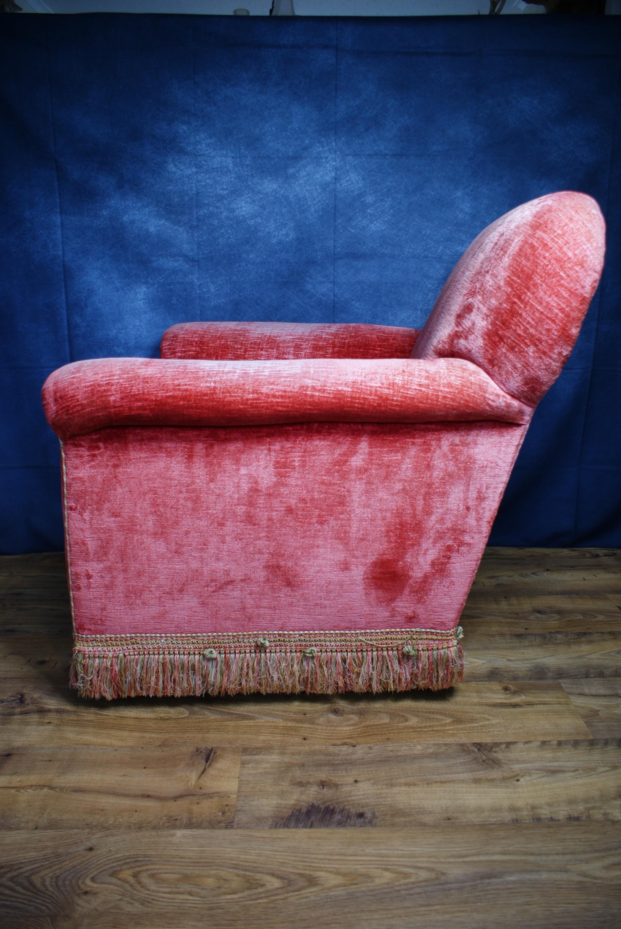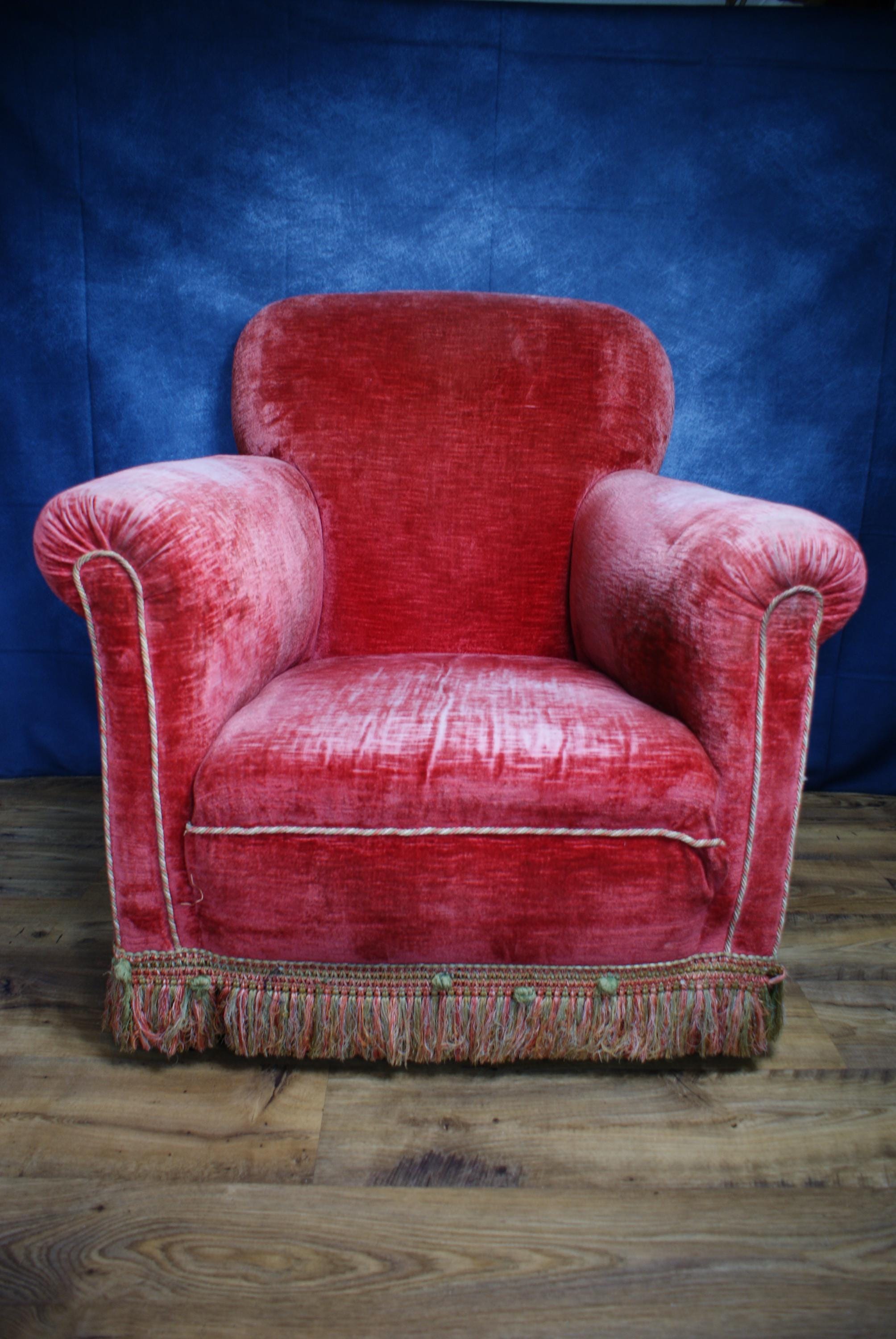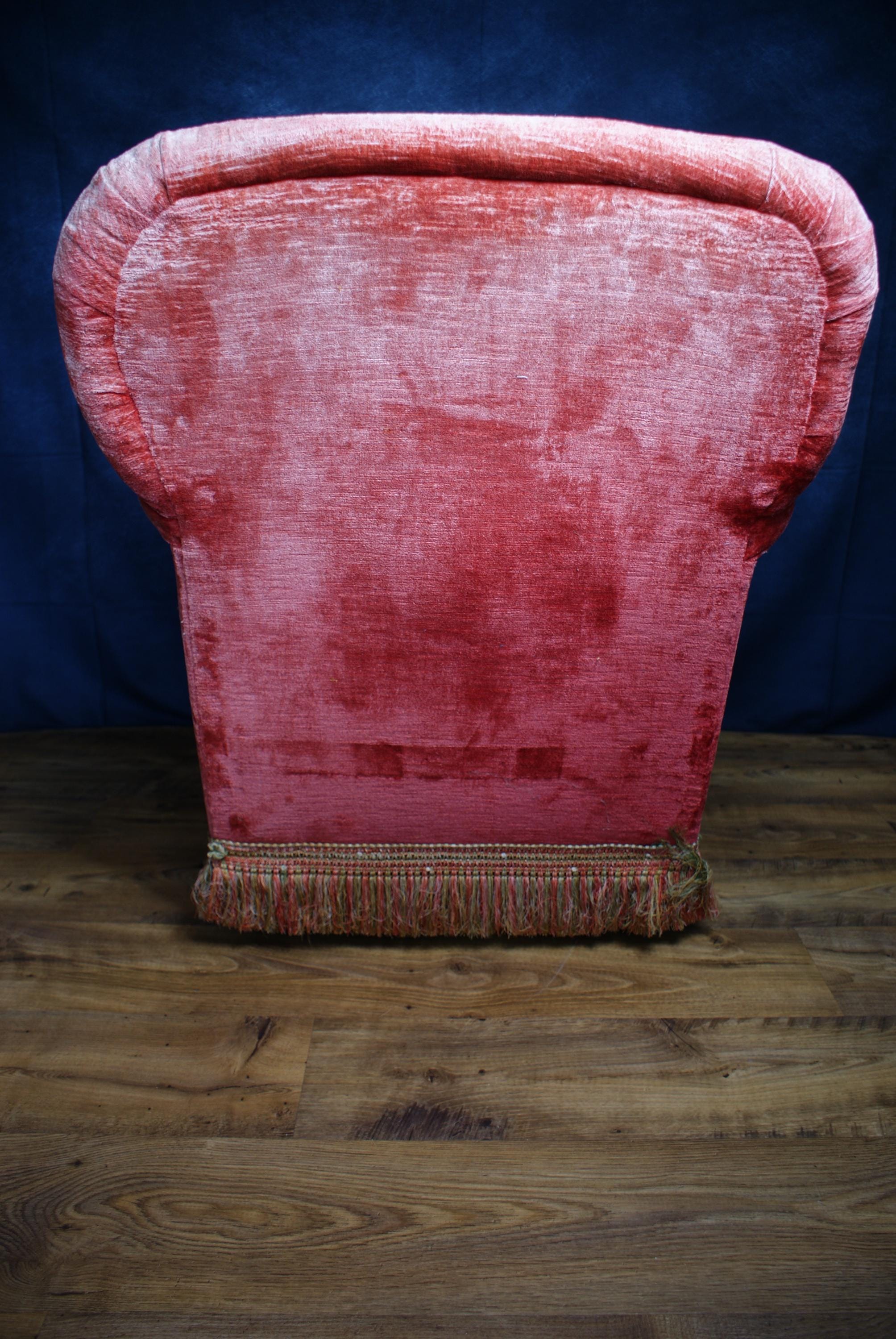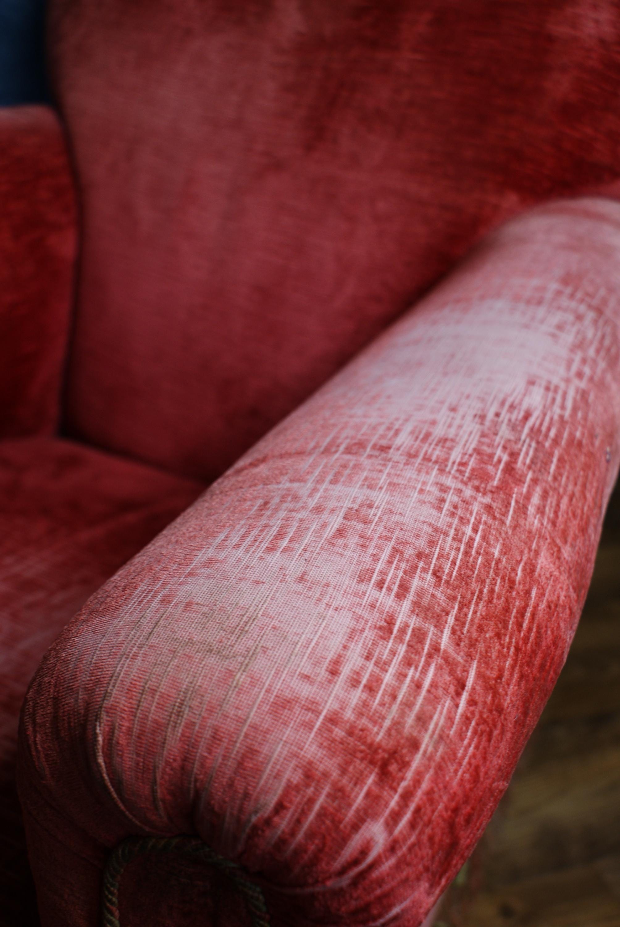 A lovely pink velvet armchair, the chair is in fantastic condition with lovely patina to the arms and seat.