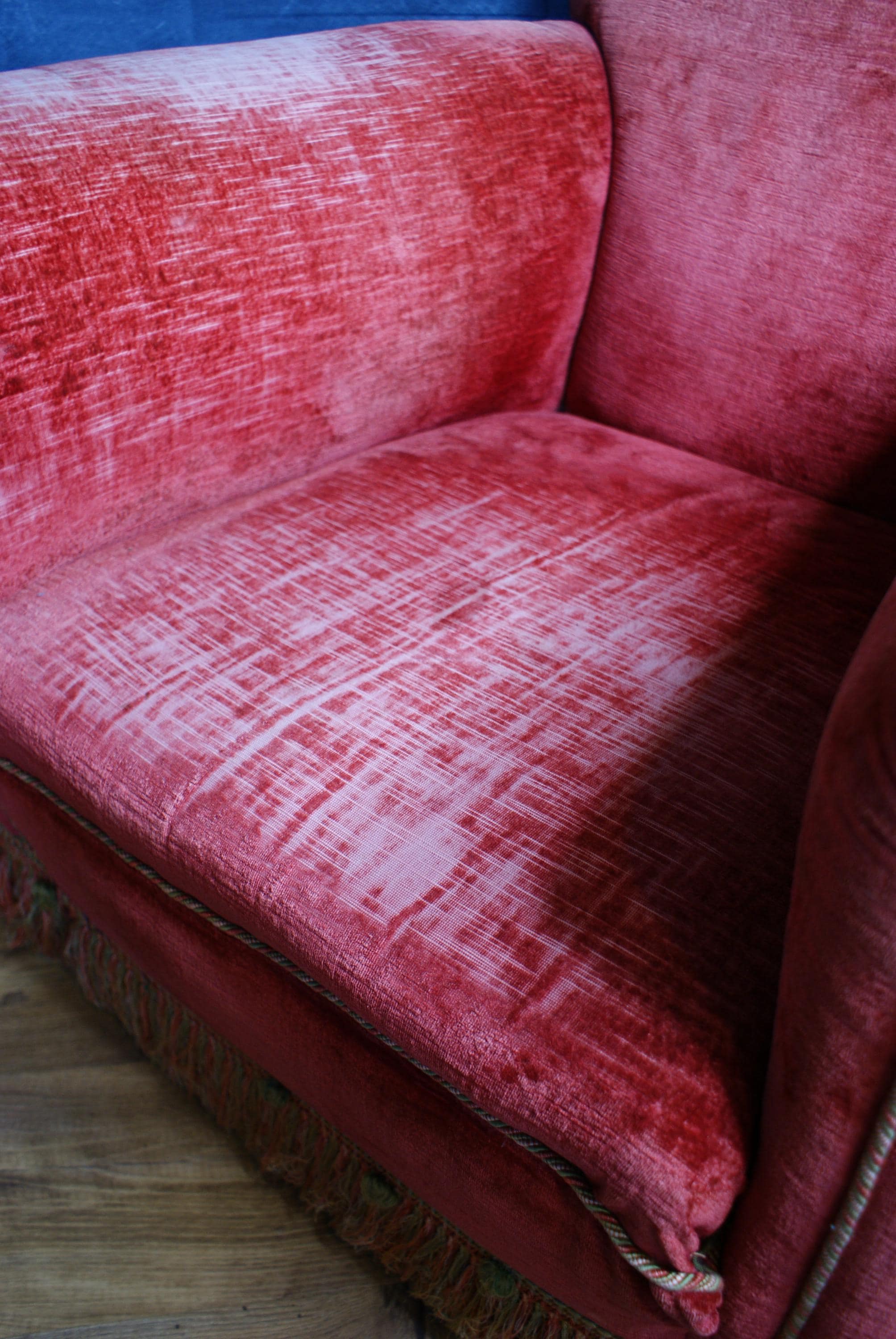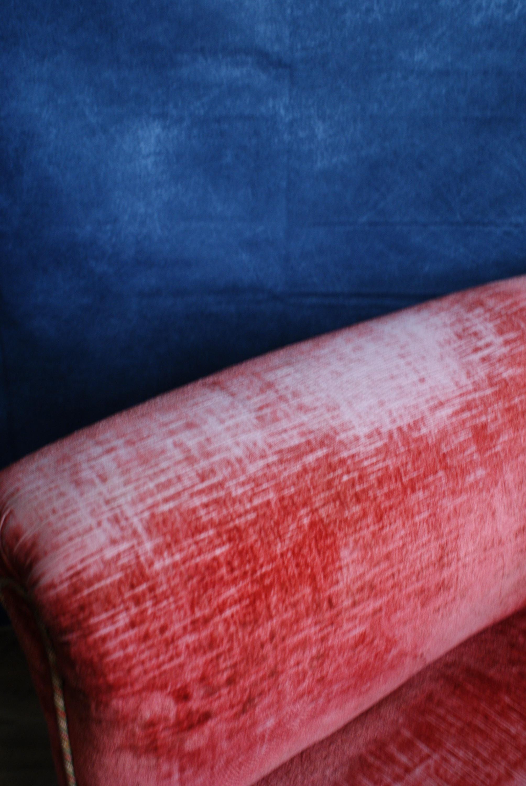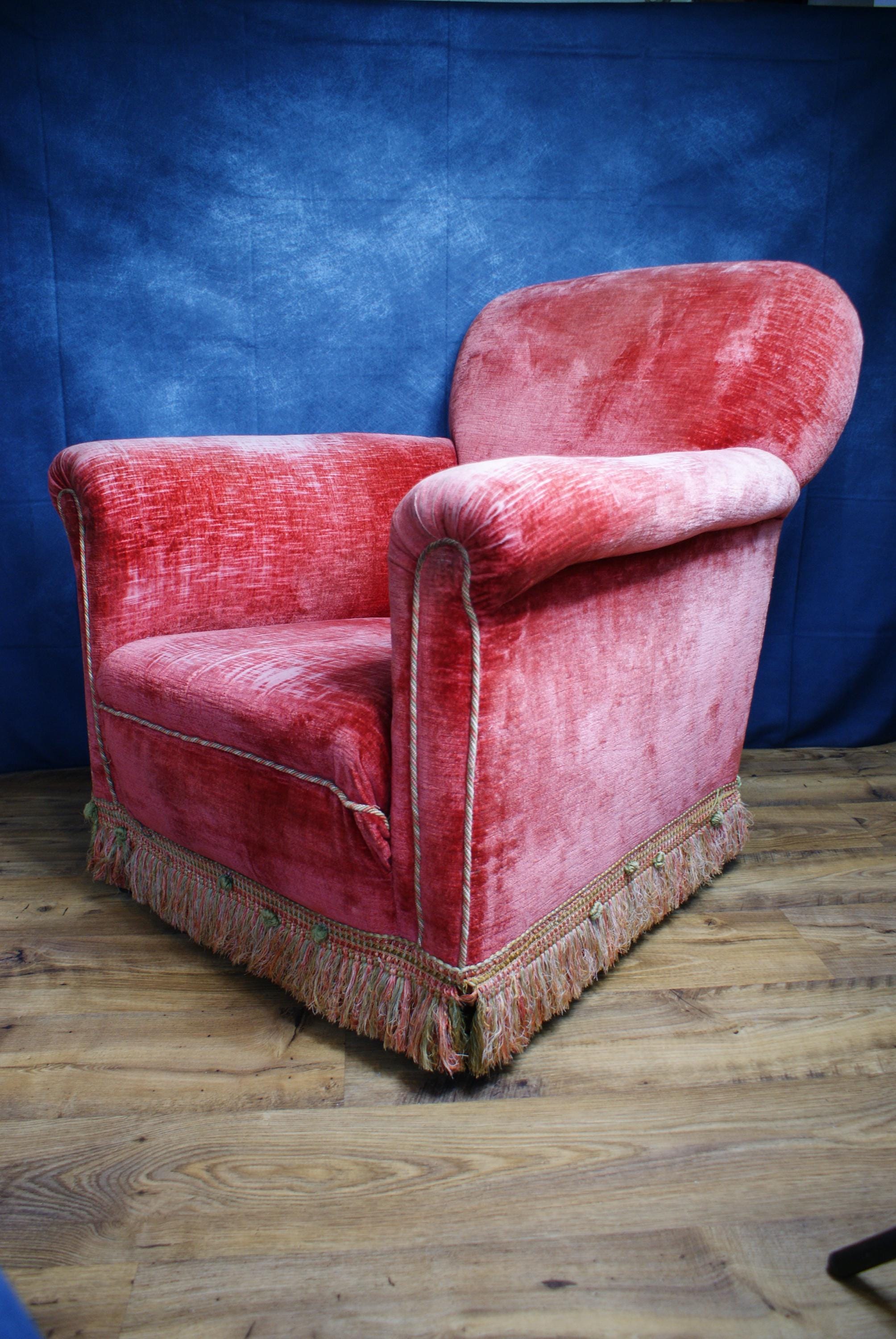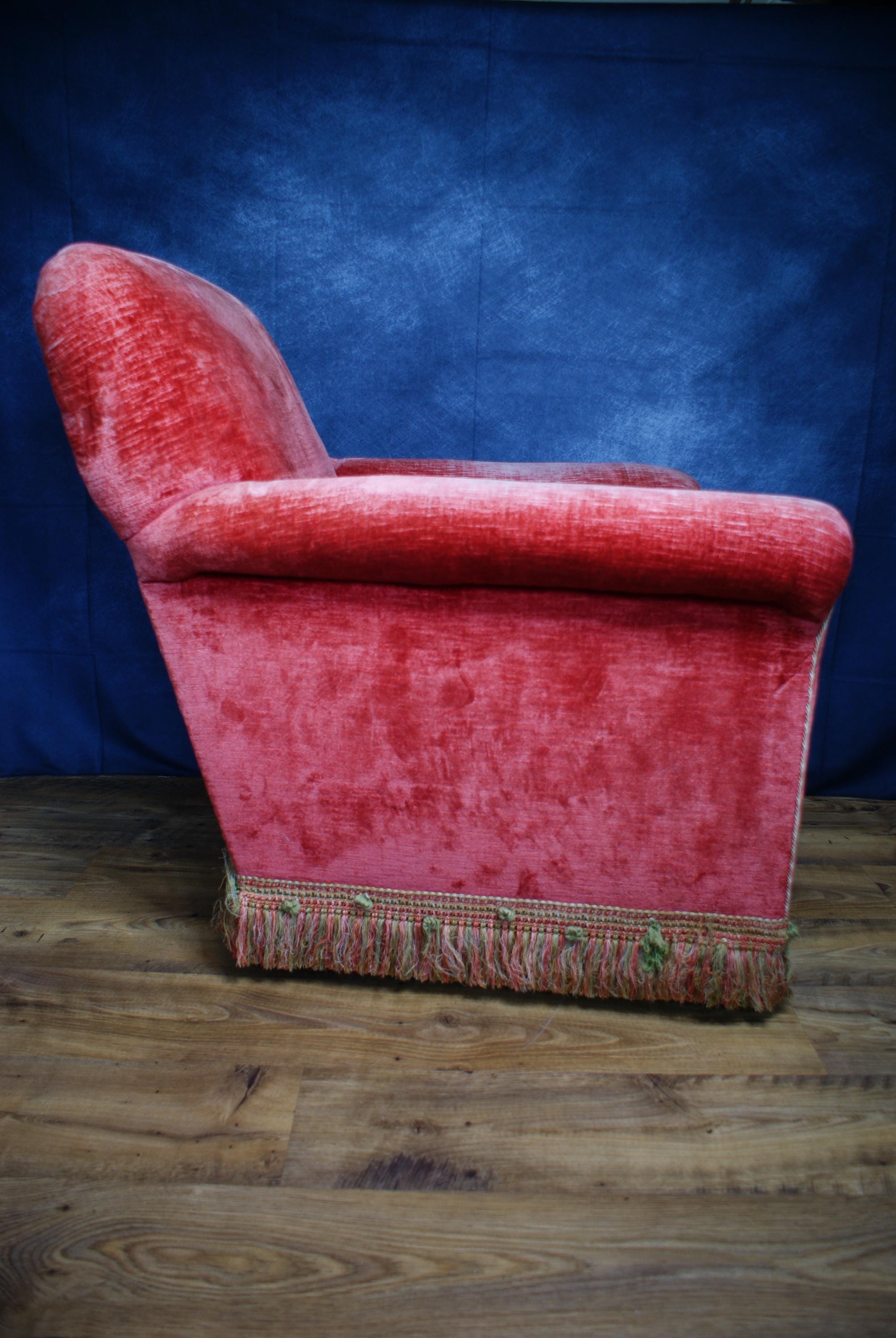 A lovely pink velvet armchair, the chair is in fantastic condition with lovely patina to the arms and seat.