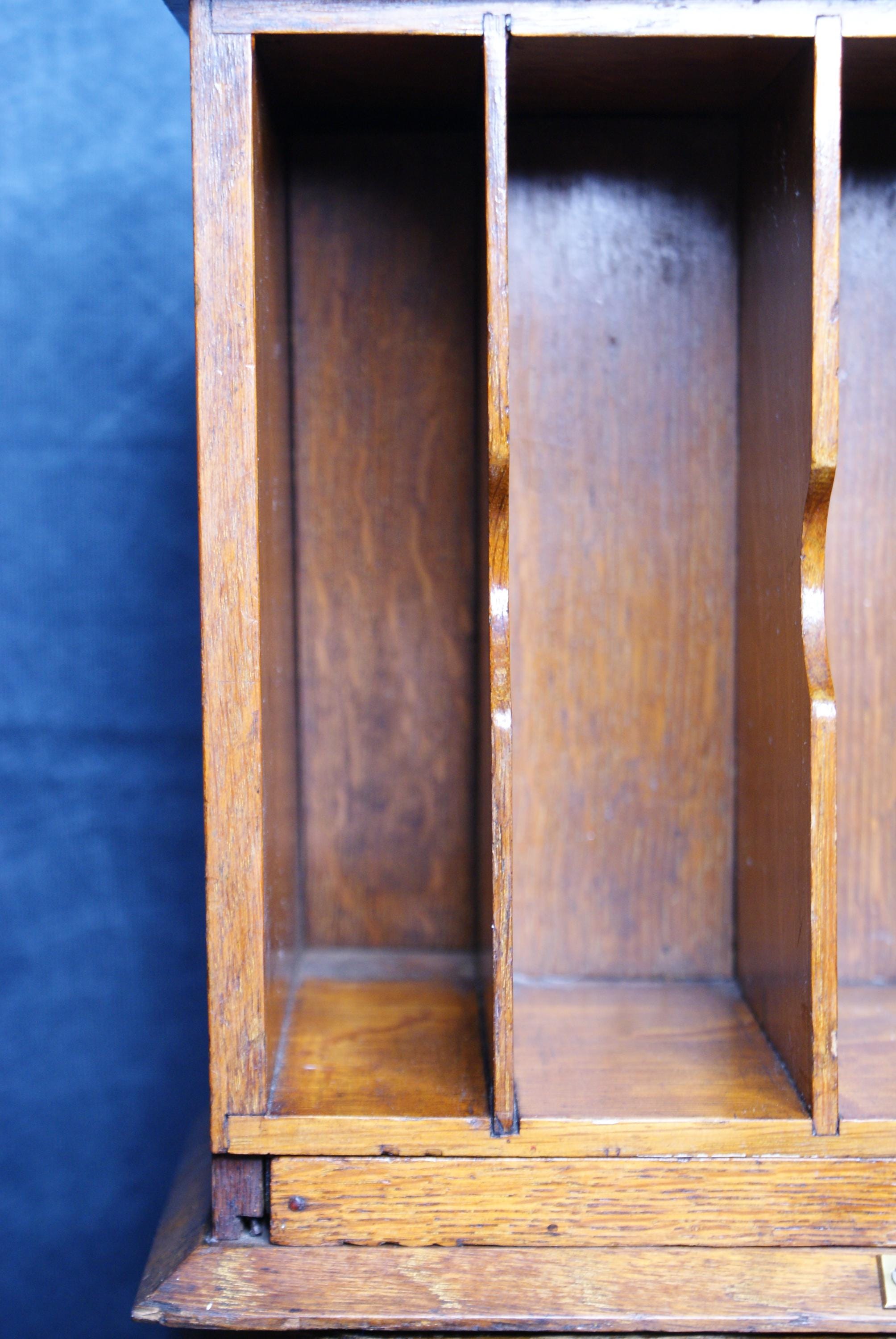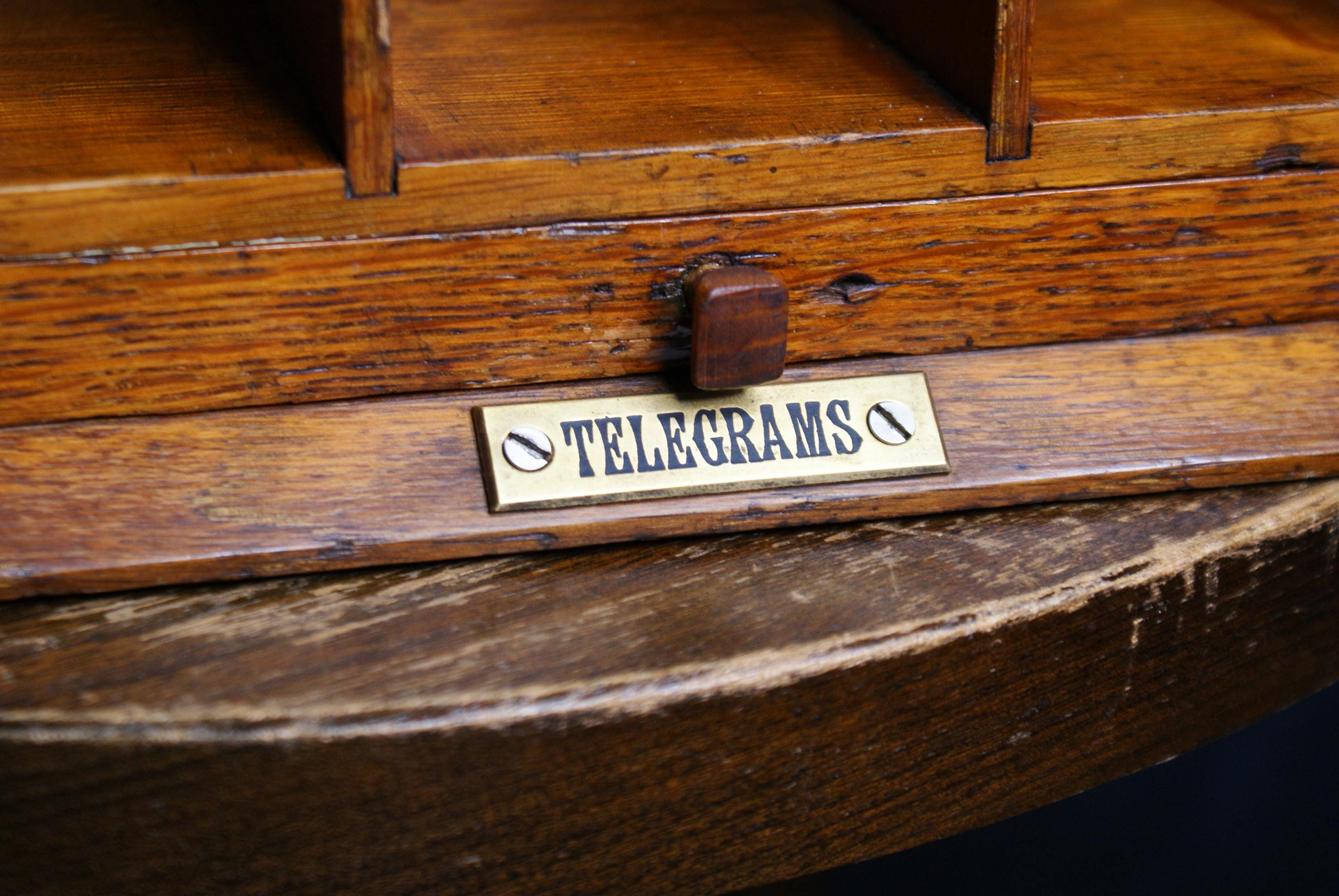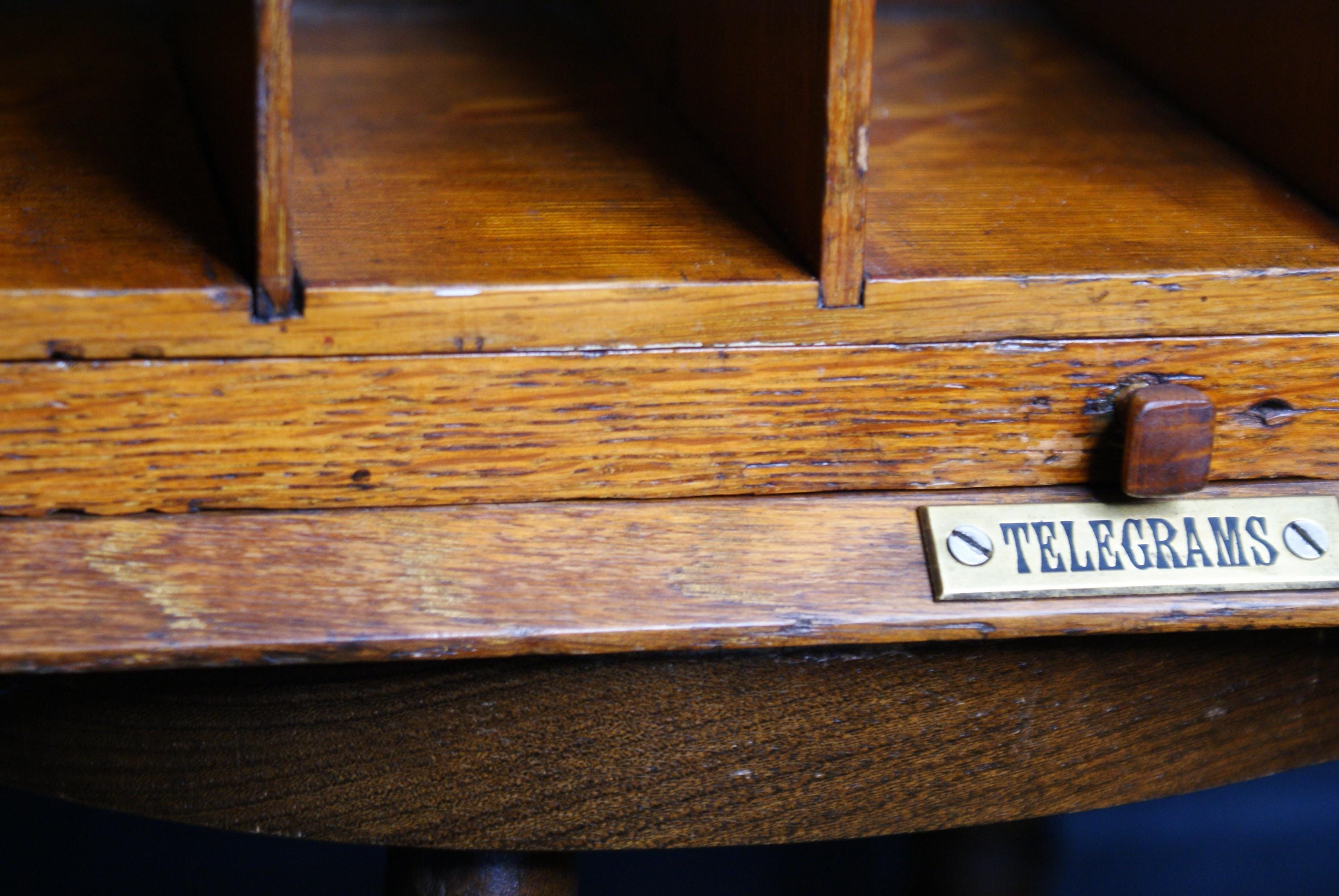 A stunning oak telegram case, dating approximately 1890. this is a lovely piece and and in excellent condition with a lovely patina. The back of the far left slot is lose and the far right is missing but this isn't noticeable when displayed and will still hold books/letters.